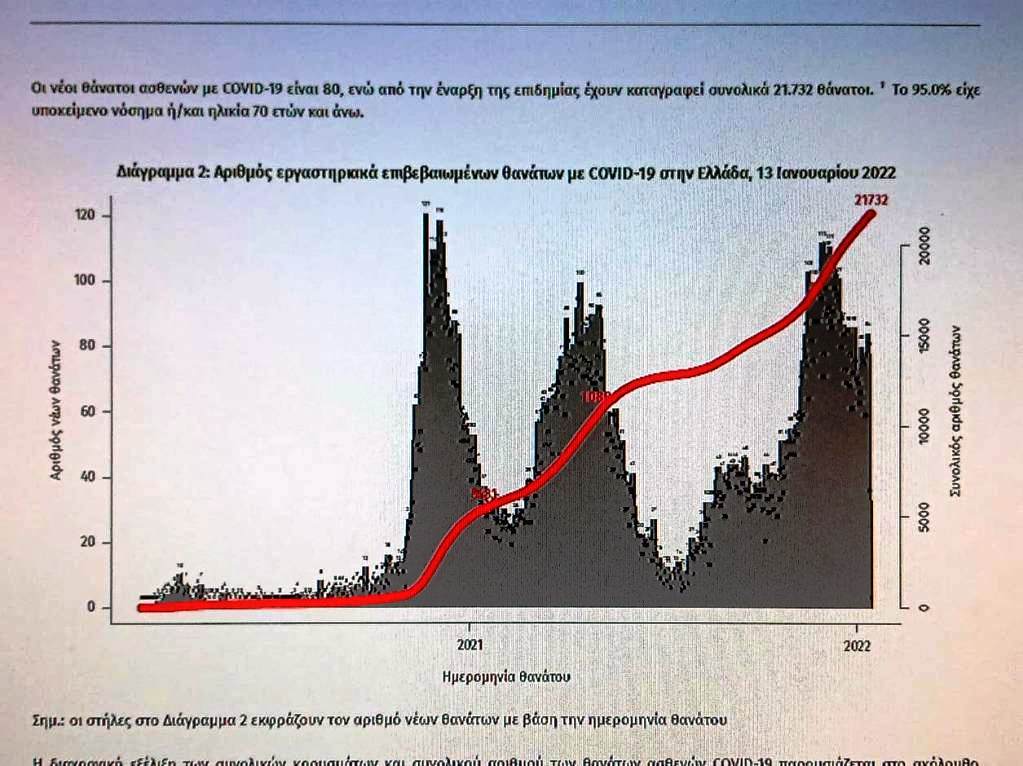 - 13/1/22 Οι νέοι θάνατοι ασθενών με COVID-19 είναι 80, ενώ από την έναρξη της επιδημίας έχουν καταγραφεί συνολικά 732 θάνατοι. 1 Το 95.0% είχε υποκείμενο νόσημα ή/και ηλικία 70 ετών και άνω.covid-gr-daily-report-20220113