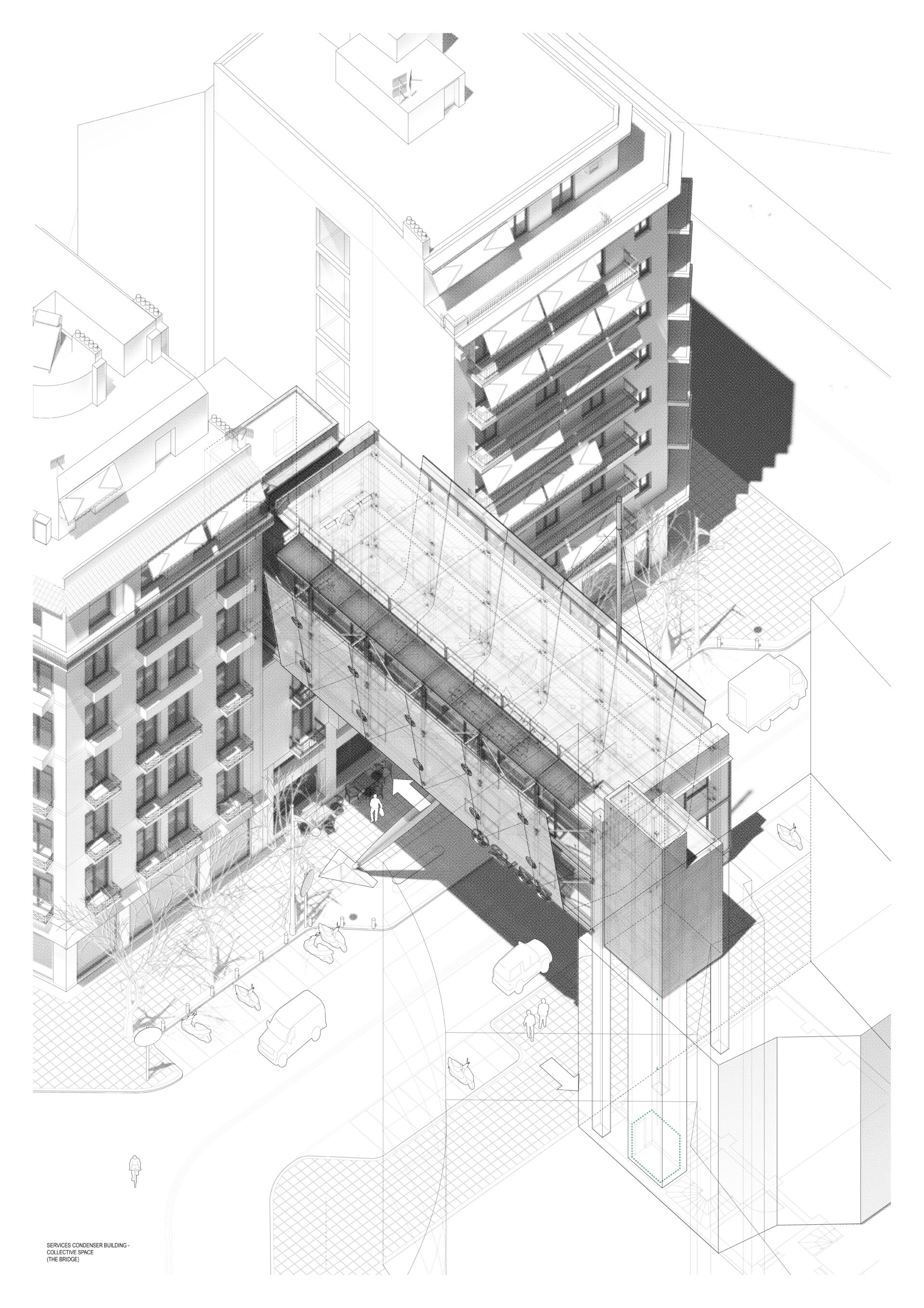 Για το τρίτο επίπεδο, ο Μάριος σχεδίασε ένα αρχιτεκτόνημα με τη μορφή γέφυρας, που θα λειτουργεί σαν το κεντρικό “delivery hub” όλου του project. Ως θέση για τη «γέφυρα» προτείνεται η οδός Αντιγονιδών, λίγο πάνω από την Εγνατία. Εδώ θα ενθαρρύνεται η επικοινωνία και η αλληλεγγύη μεταξύ των εργαζομένων, με τη λειτουργία συλλογικής κουζίνας, κέντρου ενημέρωσης, καθιστικού και μεγαλύτερων εγκαταστάσεων υγιεινής και ξεκούρασης.