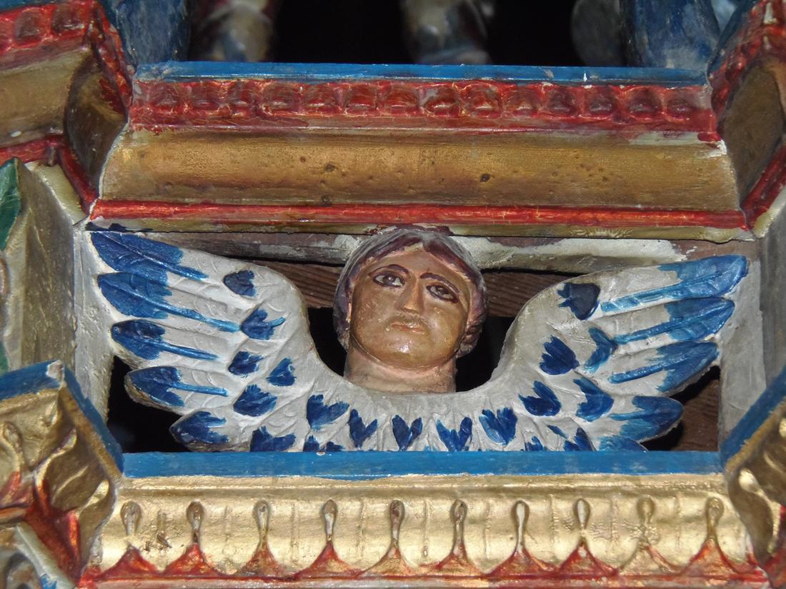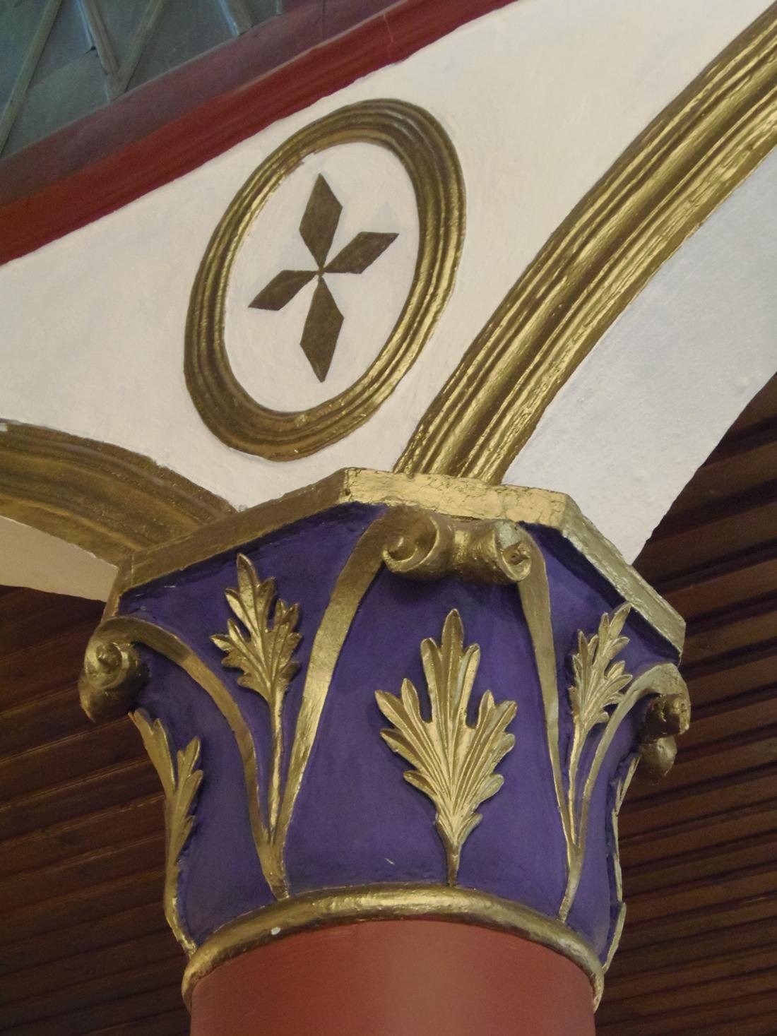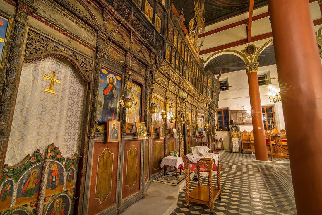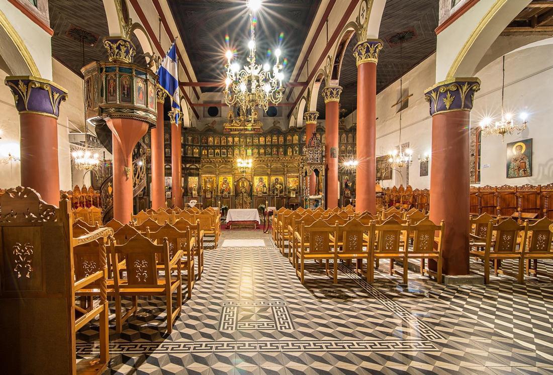 Στο εσωτερικό του ναού ενδιαφέρον παρουσιάζουν το ταβάνι με τα γεωμετρικά μοτίβα του και τα ξυλόγλυπτα, ομφάλια, το ξυλόγλυπτο τέμπλο, αξιόλογο δείγμα λαϊκής ξυλογλυπτικής τέχνης, που κοσμείται με κληματίδες αμπέλου και σταφύλια, καθώς και τα ξυλόγλυπτα στοιχεία του εξοπλισμού, όπως ο δεσποτικός θρόνος, ο άμβωνας, τα προσκυνητάρια και αγία Τράπεζα.