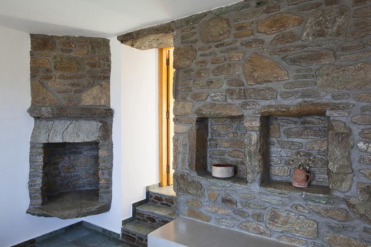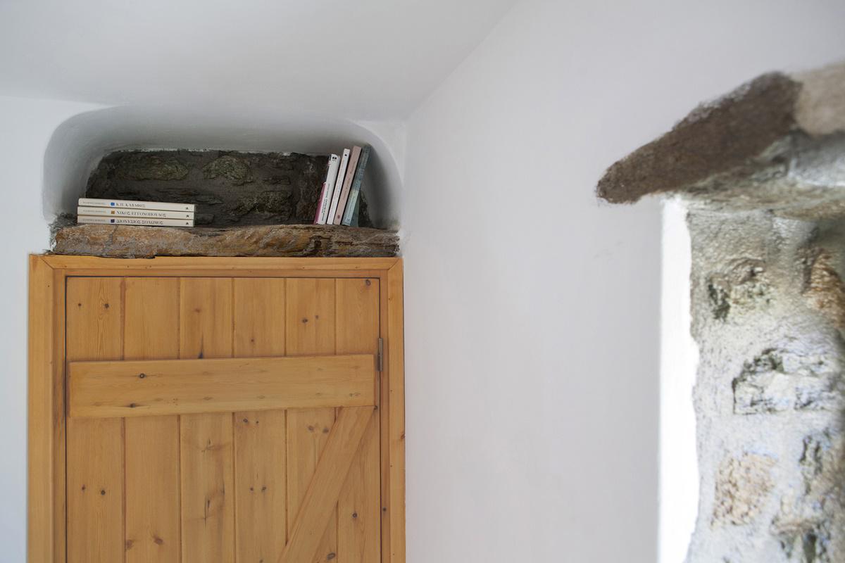 «Ως τεχνική δόμησης της πέτρας, ακολουθήθηκε η παραδοσιακή ”ξερολιθιά”. Στο εσωτερικό της κατοικίας διατηρήθηκε το τζάκι καθώς και οι εσοχές σε κάποιους τοίχους. Επίσης, αποτυπώθηκαν και επαναχρησιμοποιήθηκαν κάποιες από τις μεγάλες πέτρες στο αυθεντικό τους σχήμα, δημιουργώντας μία μοναδική υφή που αναπαράγει την αίσθηση του σπηλαίου που είχε το παλιό κελί», σημειώνει για τη διαδικασία η αρχιτέκτονας που μαζί με τη συνεργάτη της, Λουίζα Βαρελίδη, επιμελήθηκαν το project από την αρχή μέχρι το τέλος.