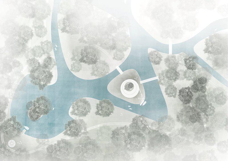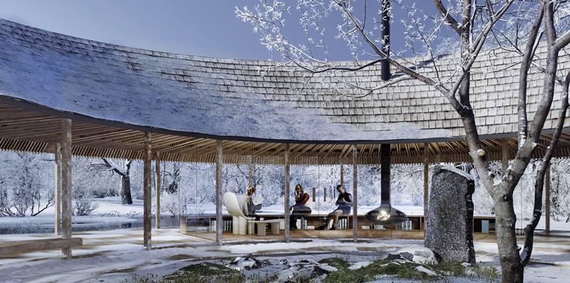 Όταν ήρθε η σειρά μίας ομάδας αρχιτεκτόνων να σχεδιάσουν ένα νέο pavillion για αυτό το εξαιρετικό περιβάλλον, αποφάσισαν να σκεφτούν αντίθετα. Ονειρεύτηκαν ένα κιόσκι όχι κρυμμένο αλλά φανερό. Που να μην αποκλείει αλλά να ενθαρρύνει δραστηριότητες. Ο ασύμμετρος σχεδιασμός του pavillion επιτρέπει τη δημιουργία μίας γυάλινης “αίθουσας ποίησης”, ενός προστατευμένου χώρου για να χαρεί κάποιος τα στοιχεία της φύσης με ένα ζεστό φλιτζάνι τσάι και ένα βιβλίο, δίπλα στο τζάκι.