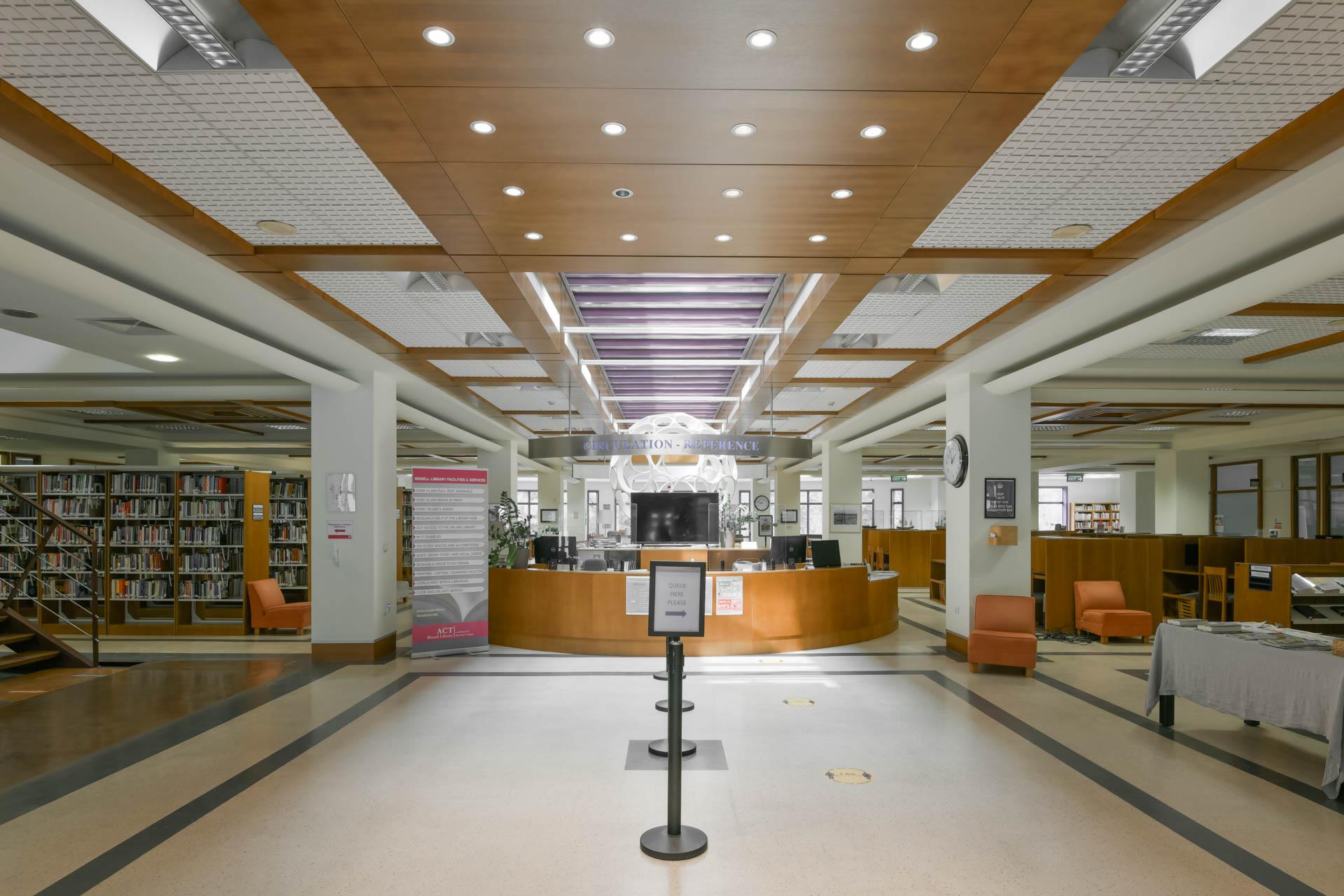 Απέναντι από την είσοδο, στον κυρίως χώρο της βιβλιοθήκης, που απομονώνεται με ένα υαλοστάσιο, υπάρχει ένα μεγάλο, κυκλικό γραφείο Δανεισμού-Πληροφόρησης, για την παροχή πληροφοριακών υπηρεσιών και τον δανεισμό βιβλίων. Το έπιπλο αυτό περιλαμβάνει ακόμα τμήματα άμεσης πληροφοριακής έρευνας και αναζήτησης υλικού. Εκατέρωθεν της εισόδου βρίσκονται ο χώρος των περιοδικών, ο οποίος από το 2012 έχει διαμορφωθεί και σε χώρο χαλάρωσης και κοινωνικής αλληλεπίδρασης των φοιτητών, ο χώρος των νέων βιβλίων και ο χώρος διοίκησης της βιβλιοθήκης.