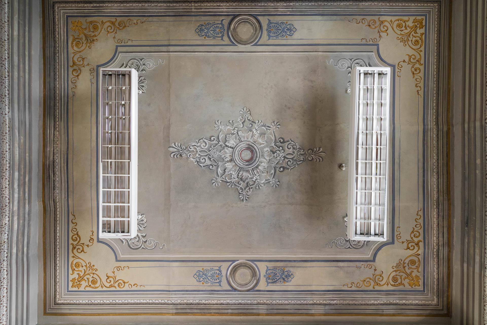 Στον εσωτερικό χώρο, στον όροφο, σώθηκαν και αποκαταστάθηκαν οι οροφογραφίες του σαλονιού και των δωματίων καθώς και ο διάκοσμος των τοίχων. Κάθε δωμάτιο του ορόφου έχει διαφορετικό θέμα διακόσμησης που δημιουργήθηκε με την τεχνική της νωπογραφίας.