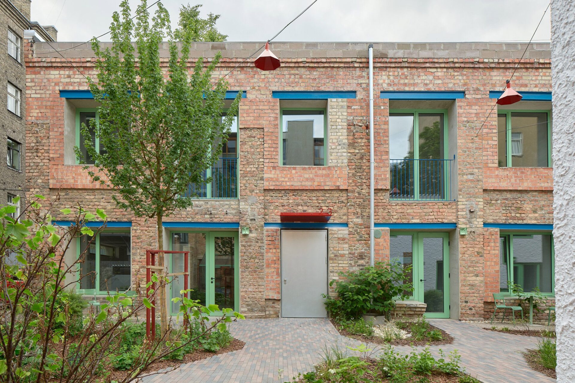 Κόκκινες μεταλλικές στέγες στεγάζουν τις εισόδους των διαμερισμάτων της αυλής και μια βαθύτερη απόχρωση του κόκκινου χρησιμοποιήθηκε για να ολοκληρωθούν τόσο τα κρεμαστά φωτιστικά της αυλής όσο και τα μεταλλικά στοιχεία γύρω από τα δέντρα.