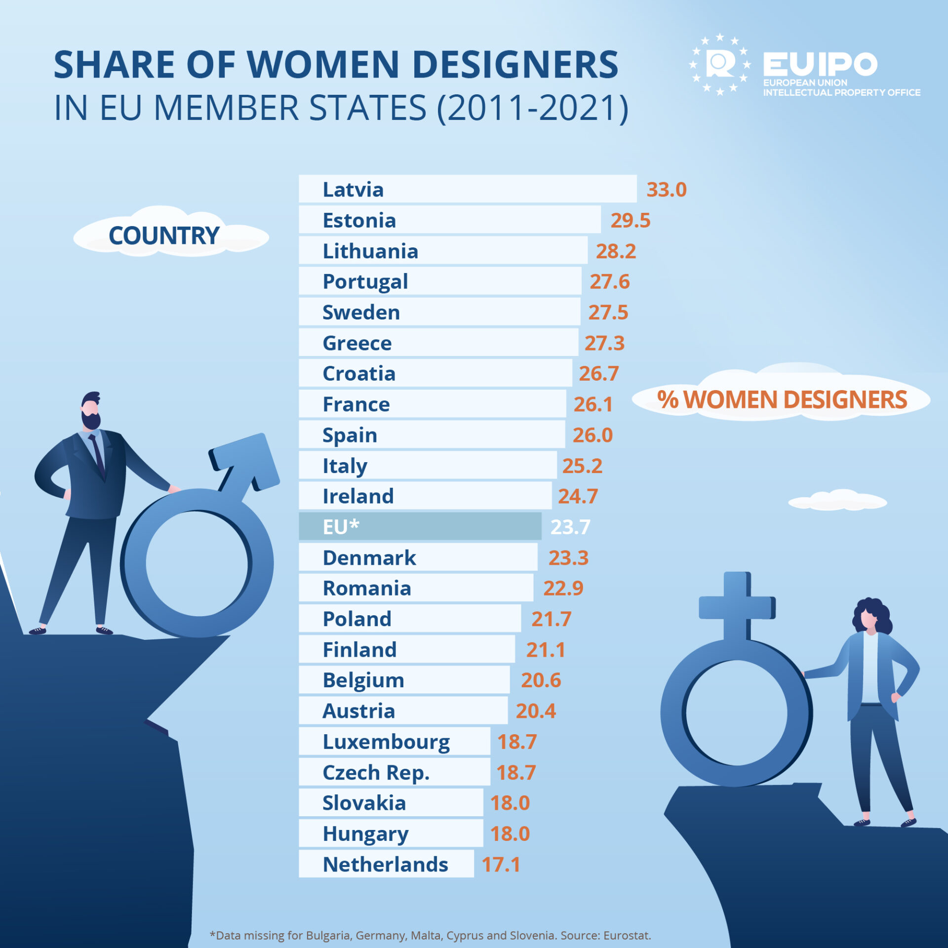 * Οι χώρες της Βαλτικής έχουν το υψηλότερο ποσοστό γυναικών σχεδιαστριών στην ΕΕ, ενώ οι Κάτω Χώρες, η Ουγγαρία και η Σλοβακία, οι χαμηλότερες.