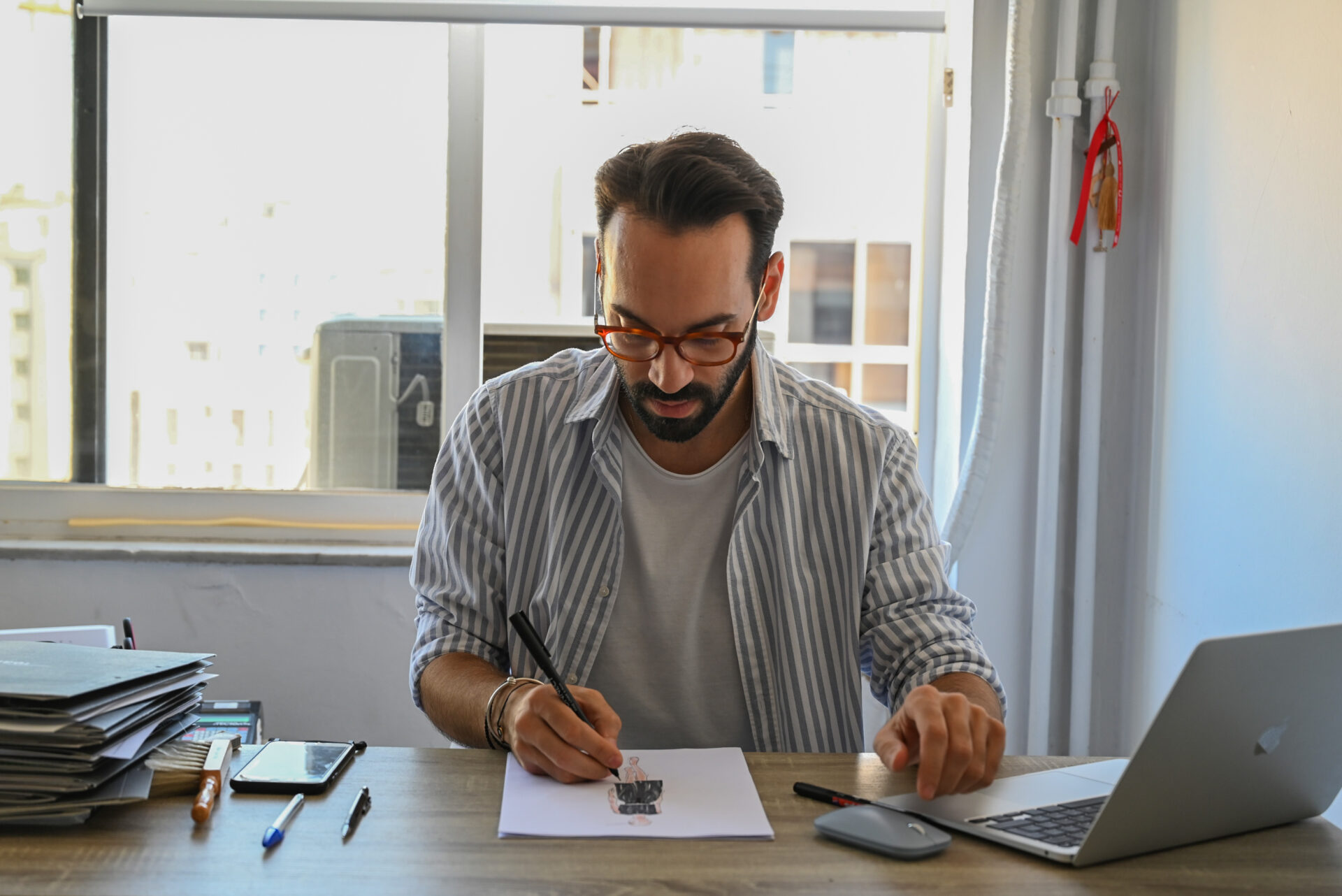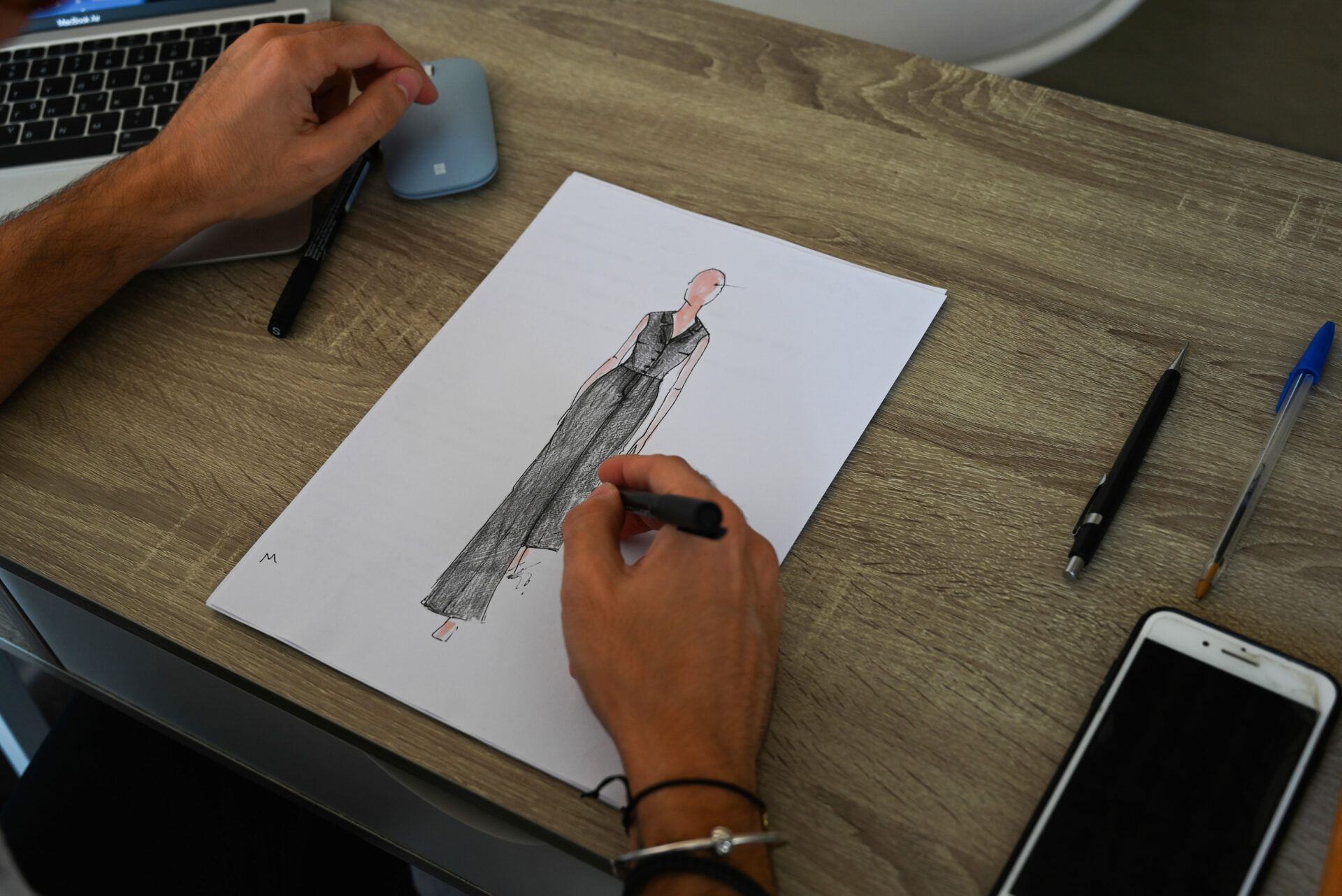 Πάντα ξεκινάω από το ύφασμα, οι βάσεις μου είναι σε αυτό και στην ραφή και μετέπειτα έρχεται το σχέδιο. Θέλω τα ρούχα μου να είναι ποιοτικά. Αν σχεδιάσω 1-2 ρούχα μετά θα μου βγει όλη η συλλογή αυτόματα. Ακούω συγκεκριμένη μουσική όταν σχεδιάζω, σκέφτομαι τις γυναίκες τις ζωής μου και φαντάζομαι τα ρούχα μου επάνω τους. Από εκεί και πέρα, παρατηρώ τις γυναίκες που βλέπω στον δρόμο. Θα σκεφτώ κάποια ρούχα πάνω σε διαφορετικές γυναίκες και θα τα μεταποιήσω.