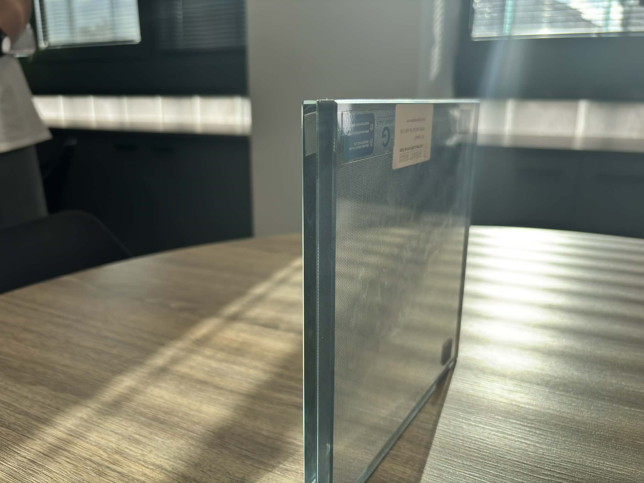 Το γυαλί έχει ιχνηλάτηση από τον ήλιο και έχει δύο όψεις με διαφορετική επεξεργασία ώστε να εμφανίζεται ημιδιαφανές και επίσης η μια πλευρά είναι με μπλε απόχρωση για να ταιριάζει με την ΕΥΑΘ.