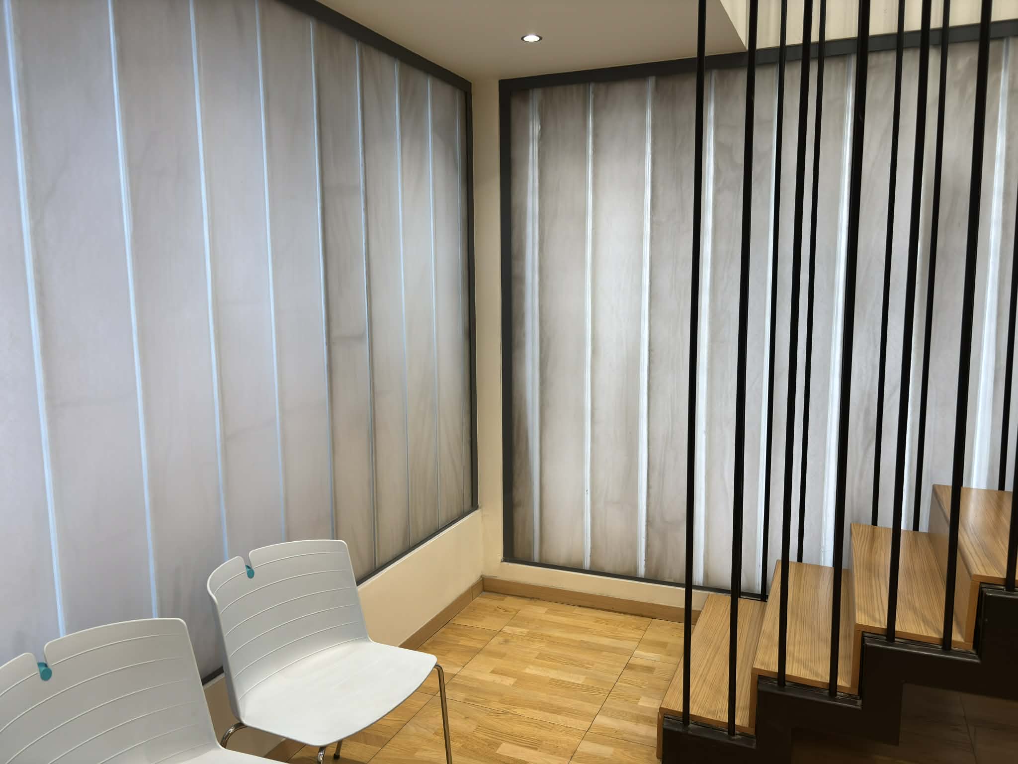 Στον 8ο όροφο επικρατεί το ξύλινο στοιχείο και όπου υπάρχουν οι κύβοι περιλαμβάνεται επένδυση από πετροβάμβακα και έχουν ξύλινη ηχοαπορροφητική επένδυση έτσι ώστε ο θόρυβος από έξω να μην περνάει μέσα.