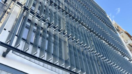 Οι περσίδες καλύπτουν κυρίως τις ζώνες των κουφωμάτων και στηρίζονται σε μεταλλικό στοιχείο τραπεζοειδούς σχήματος το οποίο με την σειρά του στηρίζεται σε μεγάλες κολόνες και έτσι οι περσίδες που ιχνηλατούν το φως είναι πολύ καλά στηριγμένες.