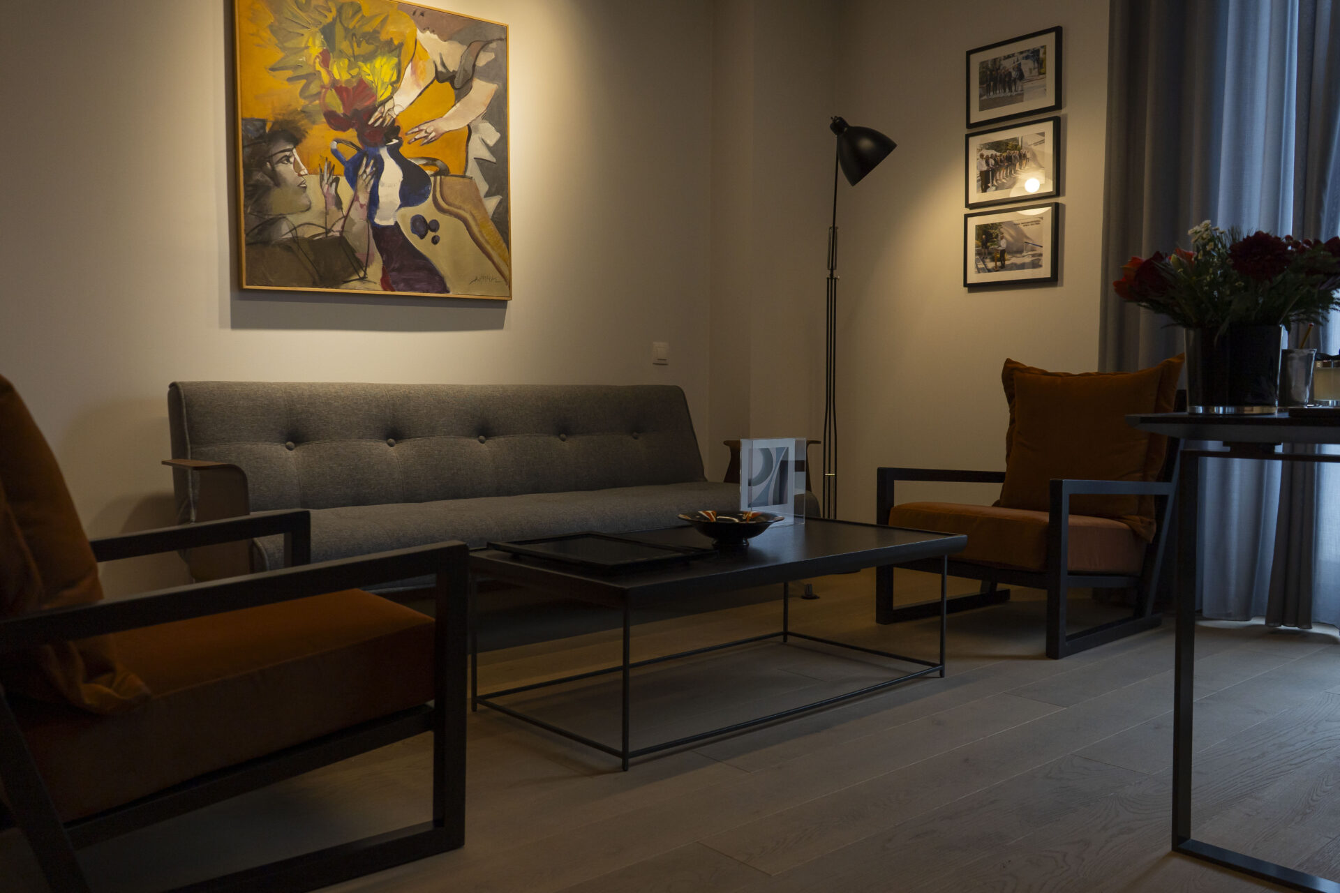 Το ξύλο στο διαμέρισμα δέχθηκε επεξεργασία για να μην είναι φθαρτό ανά τον χρόνο. Στο κέντρο του διαμερίσματος υπάρχει σαλοκουζίνα, η κουζίνα είναι φτιαγμένη από το υλικό corean το οποίο φέρει διακοσμητικές αυλακώσεις και συνδέει τους δύο χώρους. Η τραπεζαρία είναι από ξύλο καρυδιάς και η βάση της είναι από διάφανο γυαλί και δίνη την αίσθηση ότι αιωρείται. Οι καρέκλες-πολυθρόνες είναι custom-made σχεδιασμένες από ελληνίδα σχεδιάστρια και είναι εμπνευσμένες από την δεκαετία του 70. Η οροφή του είναι ψηλοτάβανο, περίπου 4 μέτρα, ο γύψινος διάκοσμος συμπληρώνει τον ήδη υπάρχοντα.