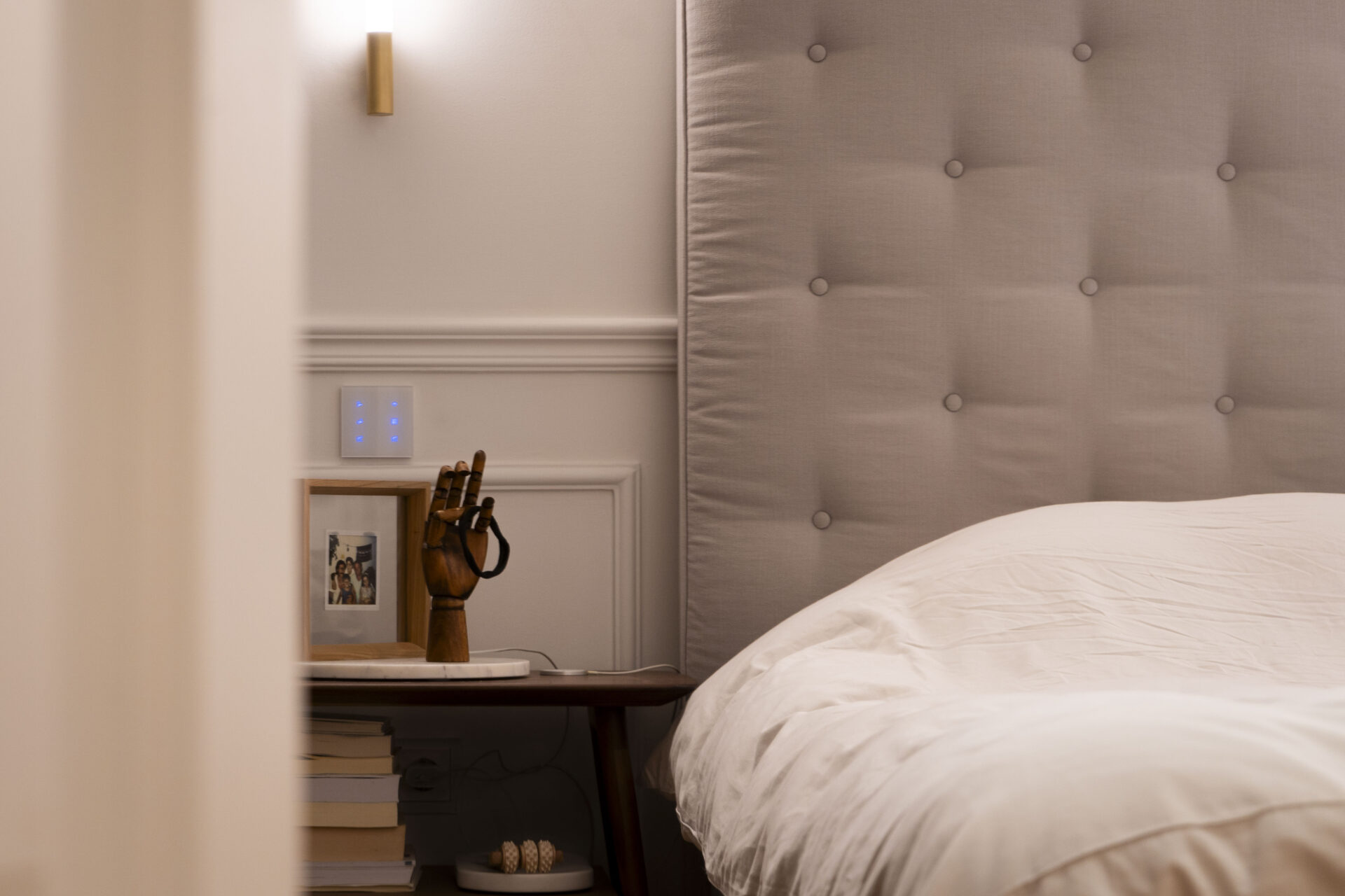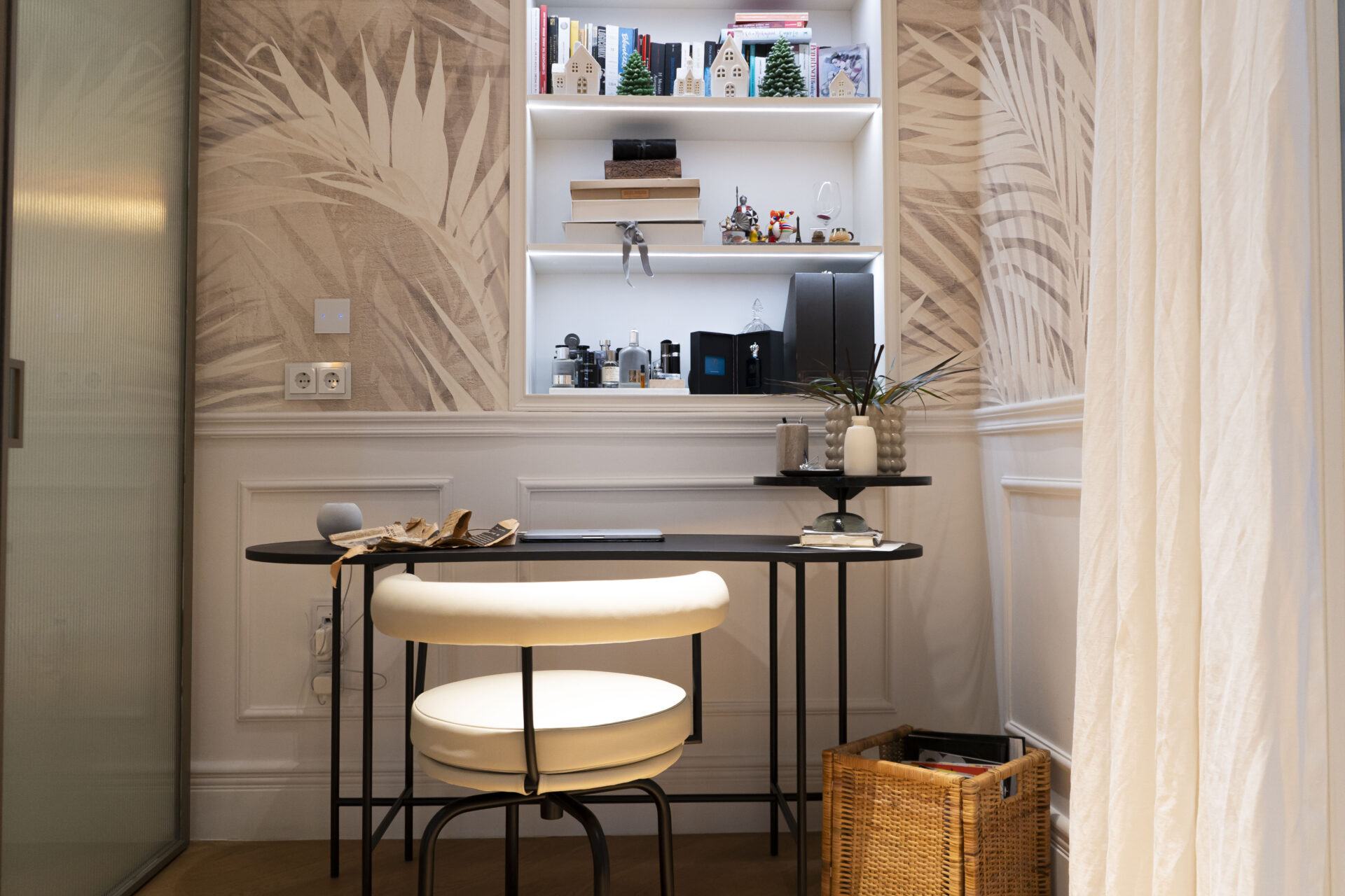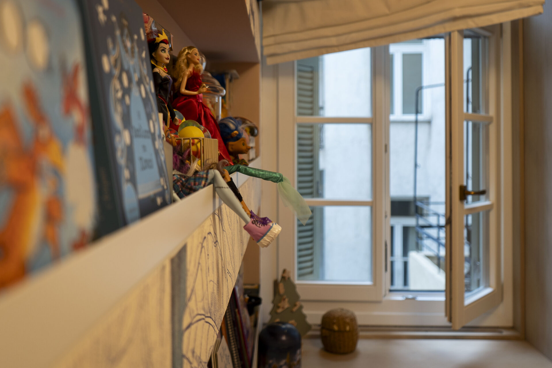 Εκεί που βρίσκεται το παιδικό δωμάτιο αρχικά υπήρχε το καπνιστήριο, ήταν σύνηθες στις αστικές περιοχές της πόλης. Για την αξιοποίηση του κατασκευάστηκε μία μεταλλική διώροφη πλατφόρμα η οποία ντύθηκε από ξύλο και επάνω τοποθετήθηκε το κρεβάτι. Από κάτω αναπτύσσεται η ντουλάπα, το γραφείο και η βιβλιοθήκη. Λόγω της στενότητας του χώρου υπάρχουν κρυφοί αποθηκευτικοί χώροι. Το δωμάτιο επεκτάθηκε κάτω 80 εκατοστά προς τον διάδρομο ώστε να ανταποκρίνεται στις ανάγκες του παιδιού και να είναι η ενιαία όψη στον διάδρομο. Το κοινόχρηστο λουτρό, αποτελείται από λευκό μάρμαρο σε συνδυασμό με πράσινα κεραμικά πλακίδια και vintage ταπετσαρία η οποία προσδίδει θεατρικότητα στον χώρο.