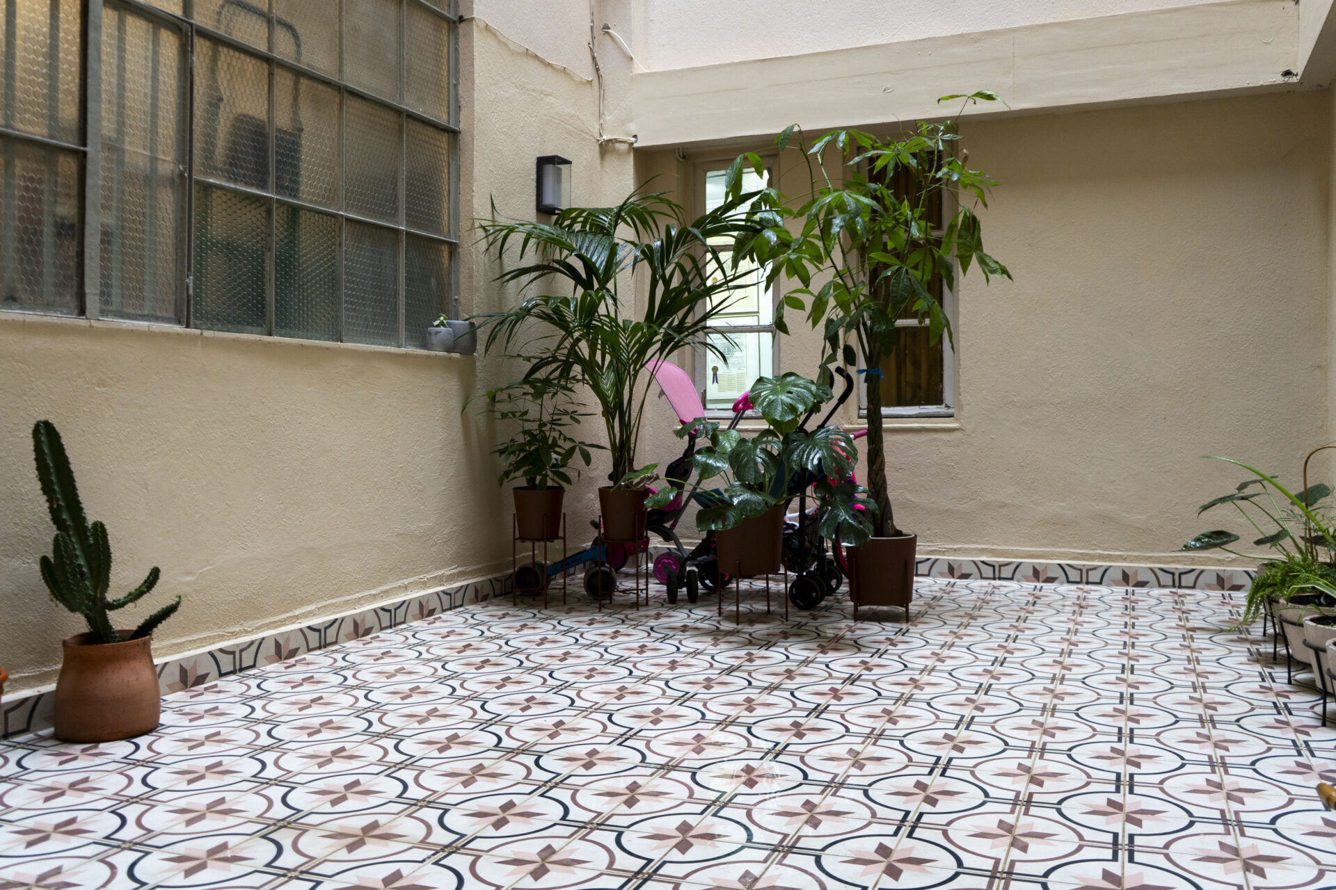 Μπαίνοντας δεξιά από την πόρτα υπάρχει ένας χώρος γυμναστικής ο οποίος αποτελείται από ένα custom made όργανο με βάρυ ενώ ακριβώς απέναντι υπάρχει το γραφείο του σπιτιού. Ο χώρος αυτός απομονώνεται από μία μεταλλική κατασκευή, η οποία αποτελείται από ημιδιάφανο γυαλί που αντανακλά το φως. Στην αρχική διάταξη σε αυτό τον χώρο υπήρχε η κουζίνα την οποία χρησιμοποιούσε το οικιακό προσωπικό. Στον χώρο αυτόν υπάρχει ένα αίθριο “εσωτερικό” μπαλκόνι, το οποίο είναι κοινόχρηστο για τα διαμερίσματα και έχει μωσαϊκό πάτωμα ενώ χαρίζει φως και αποτελεί έναν χώρο πρασίνου. Παλαιότερα στο αίθριο υπήρχε το εξωτερικό κλιμακοστάσιο, σήμερα αποτελεί έναν χώρο συνάντησης και κοινωνικοποίησης.