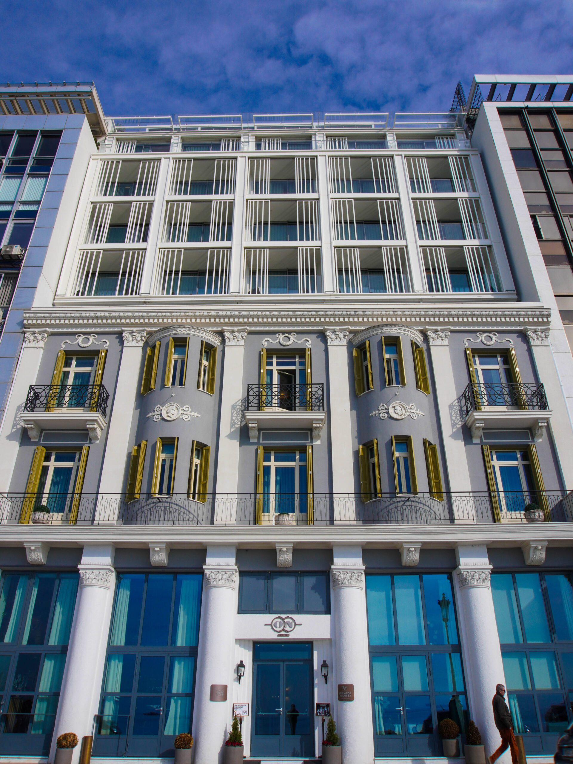 Οι όψεις των προσχεδίων περιγράφουν ένα διαφορετικό κτίριο από αυτό που υλοποιήθηκε, αν και διατηρήθηκαν οι βασικές αρχές οργάνωσης. Έτσι, η κύρια όψη του κτιρίου επί της οδού Κομνηνών οργανώνεται τριμερώς με τονισμένο τον κεντρικό κάθετο άξονα. Ως βάση του λειτουργεί η μνημειακή τοξωτή είσοδος του ξενοδοχείου προστατευμένη από το προεξέχον κεντρικό τμήμα του εξώστη του πρώτου ορόφου, στηριγμένου σε χτιστά φουρούσια και προστατευμένου από στηθαίο με κιονίσκους. Ως κορμός λειτουργεί η τριώροφη πυργοειδής προεξοχή με κεντρικό άνοιγμα σε κάθε όροφο, που επιστέφεται με καμπυλόγραμμο αέτωμα.