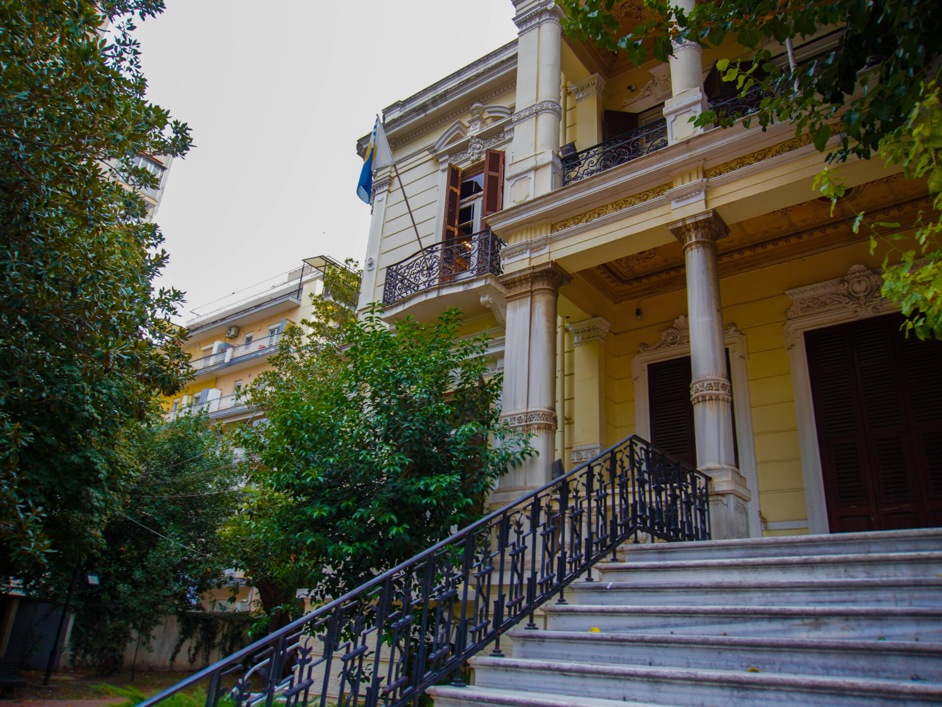 Η κύρια είσοδος του οικήματος, είναι αυτή στην όψη της Βασιλίσσης Όλγας, με την επιβλητική σκάλα. Στο αέτωμα πάνω από την είσοδο, συναντάμε την επιγραφή “Ο Αλλάχ μαζί σου”.
