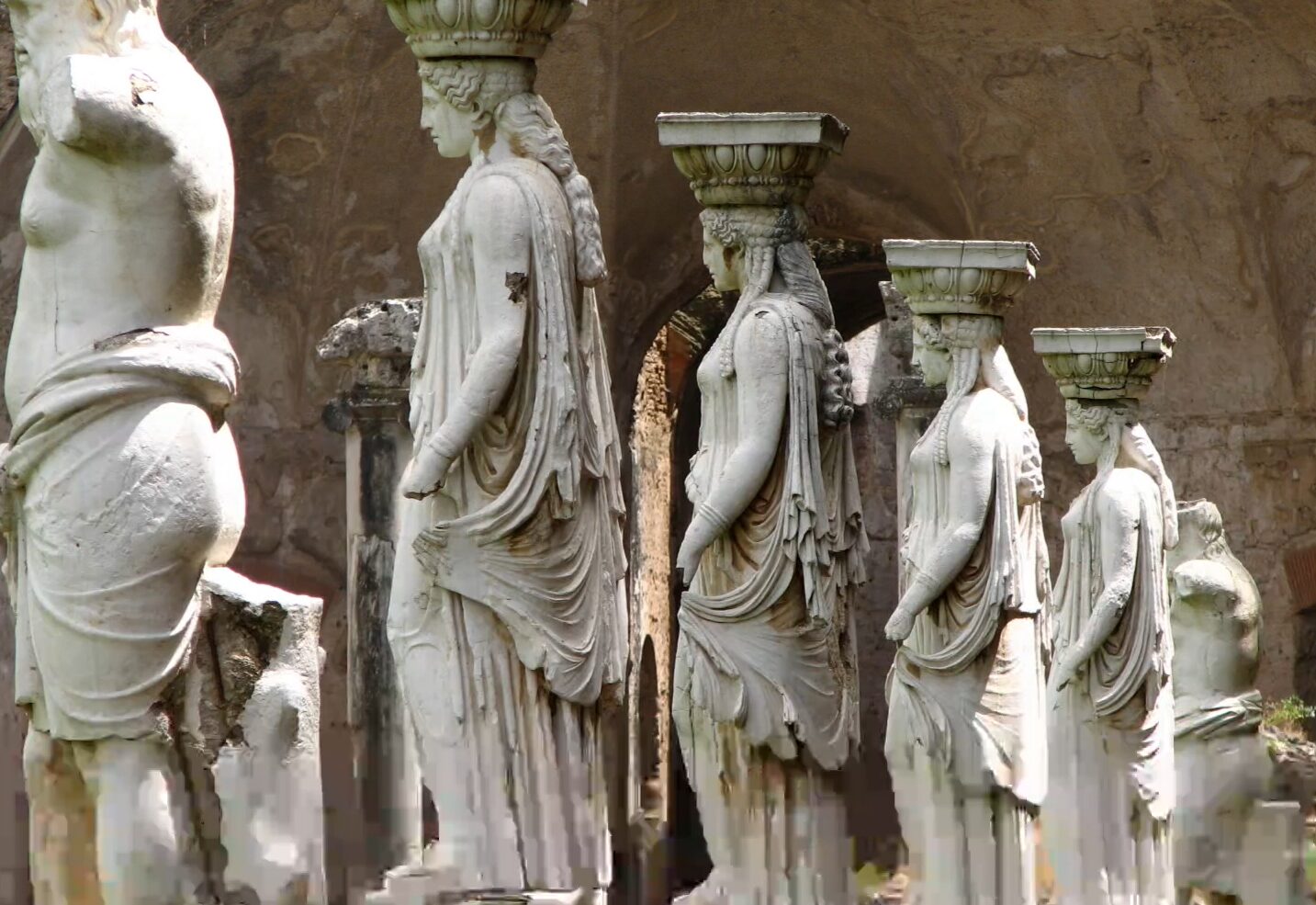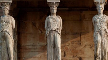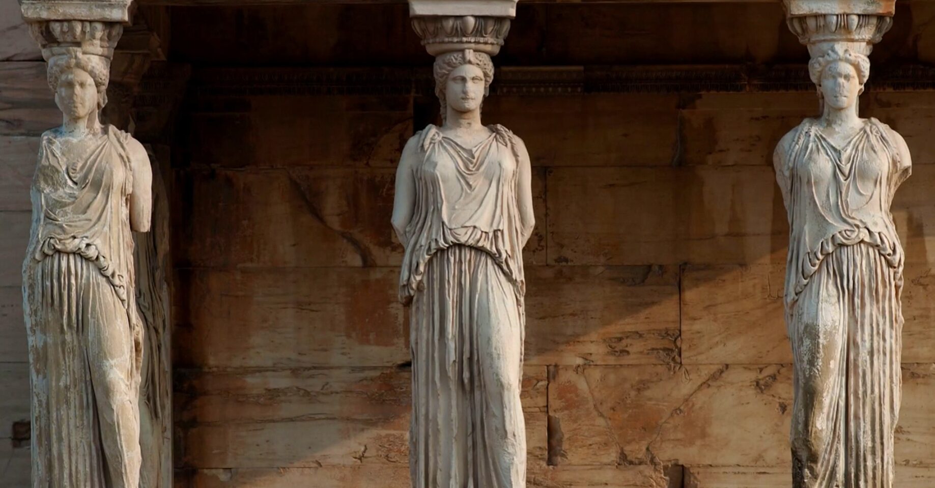 Οι μορφές αυτές στηρίζουν τις οικιστικές υπερκατασκευές σαν μεταμοντέρνοι Άτλαντες: γαλήνιες, εξιδανικευμένες και ταυτόχρονα σουρεαλιστικές μέσα στο αστικό τους πλαίσιο. Στραμμένες προς τα έξω, δείχνουν αδιάφορες τόσο για το βάρος που τις καταπονεί όσο και για την κίνηση που εκτυλίσσεται από κάτω τους, τυλιγμένες σε ρέοντα υφάσματα που παραπέμπουν ευθέως στην κλασική τους καταγωγή. Τα χαμένα χέρια τους —χαρακτηριστικό γνώρισμα του πρωτότυπου γλυπτού— παραμένουν σκόπιμα αδιόρθωτα, ενισχύοντας την αίσθηση θεατρικής ειρωνείας και υπονομεύοντας κάθε προσδοκία μνημειακής σοβαρότητας.
