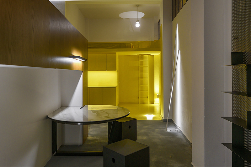 Σε ένα κτίριο της δεκαετίας του 1970, που στέγαζε γραφεία και βιοτεχνικούς χώρους, ανασχεδιάστηκαν ένα διαμέρισμα και το δώμα. Η κατοικία σχεδιάστηκε το 2016 ως γραμμική αλληλουχία 4 βασικών δραστηριοτήτων (μαγείρεμα, τραπεζαρία, χαλάρωση, ύπνος), χωρίς εσωτερικούς τοίχους, όπου το υπνοδωμάτιο είναι ένας ξύλινος κύβος που κινείται ελεύθερα στο χώρο. Το κοινόχρηστο pavilion στο δώμα, με μεγάλο ύψος και ανοίγματα, ένα σπάνιο δείγμα αστικής αρχιτεκτονικής, που λειτουργούσε ως χώρος συνελεύσεων, μετατράπηκε το 2022 σε αίθουσα γιόγκα, πιλάτες και χορού.