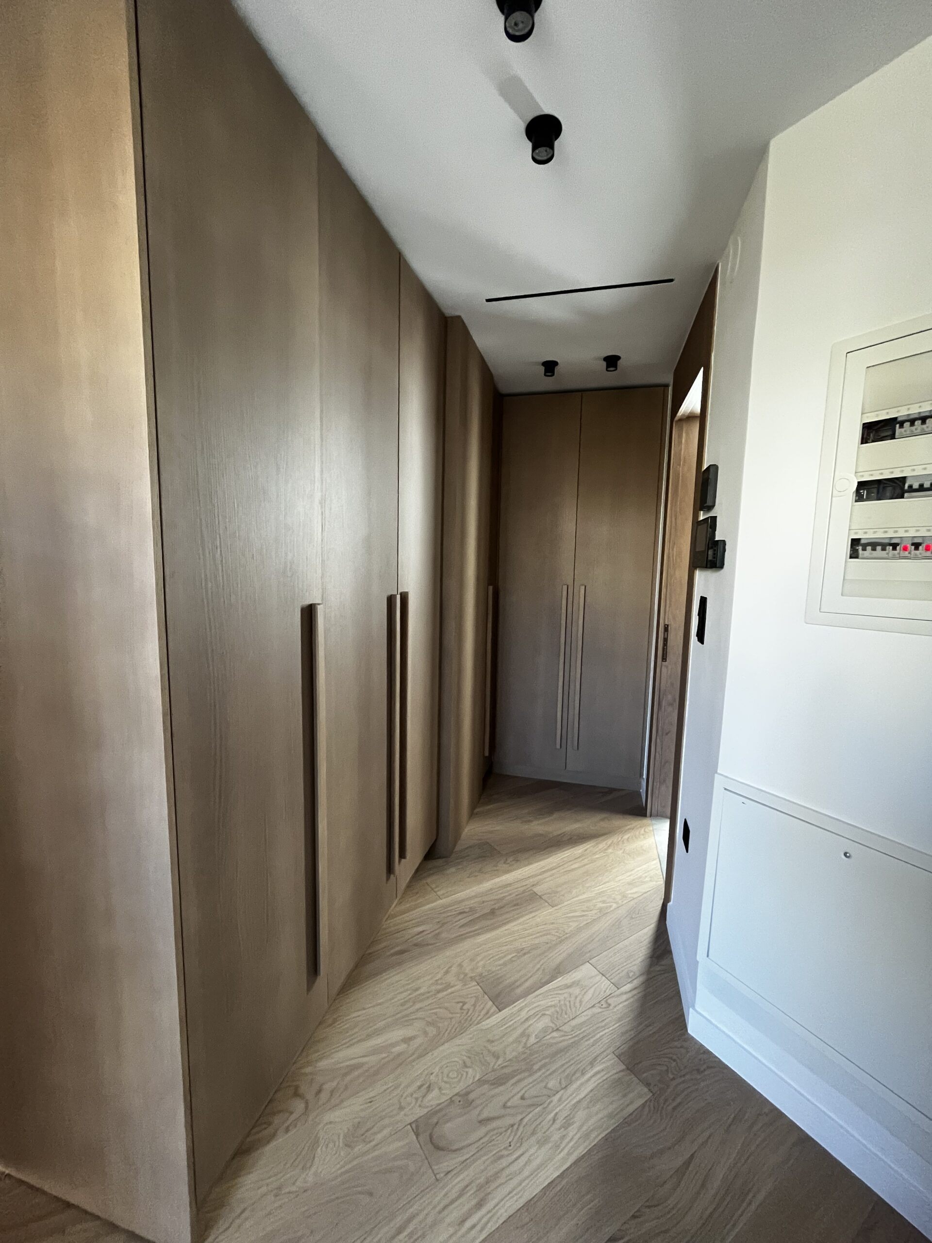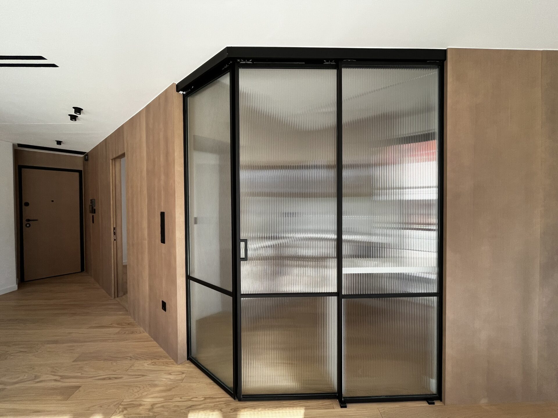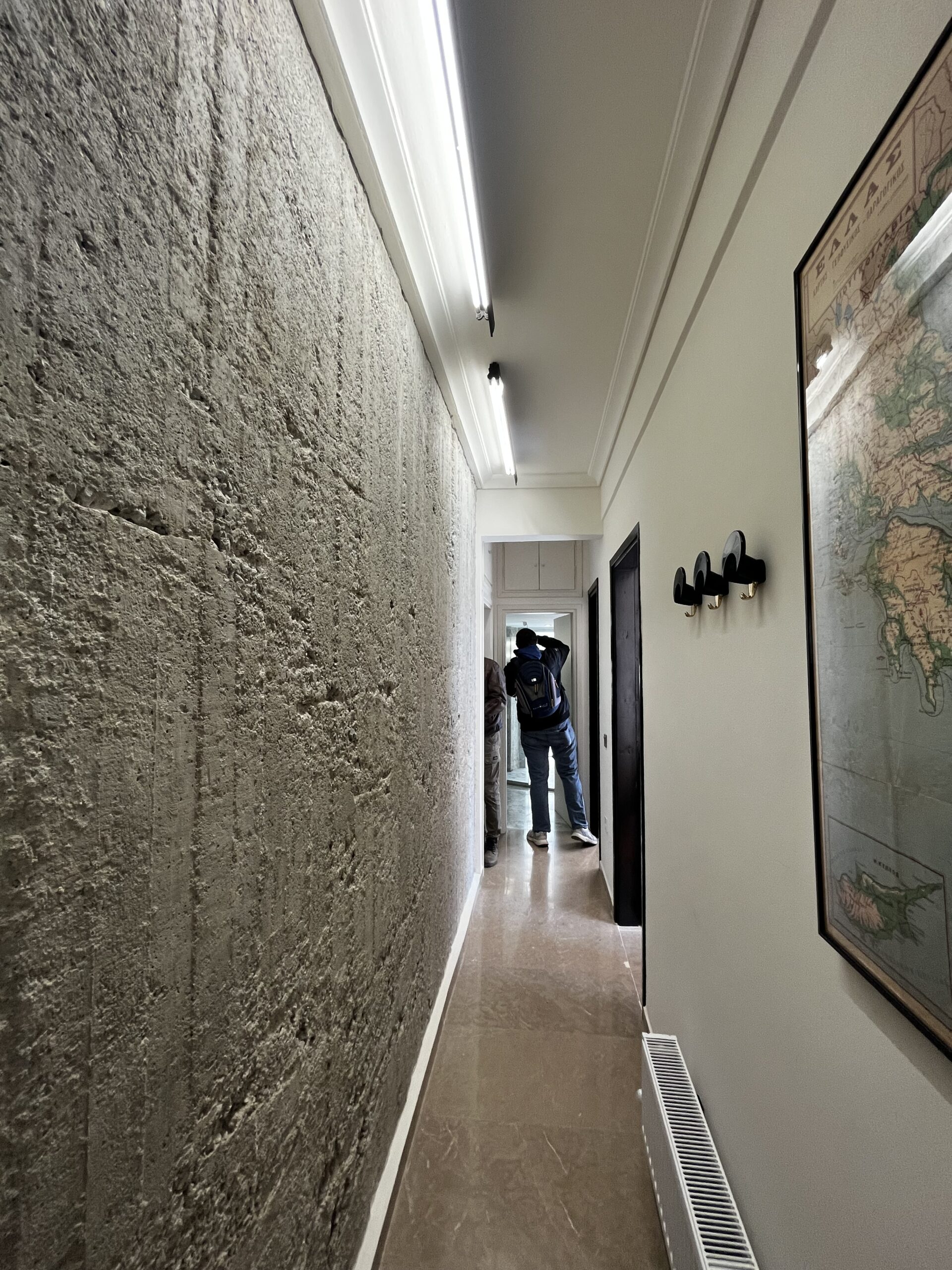 Ο διάδρομος έχει διαχωριστική τοιχοποιία για αισθητική λειτουργία, όπου αφού αφαιρέθηκε ο σοβάς, αποκαλύφθηκε το οπλισμένο σκυρόδεμα, το οποίο περάστηκε με ένα ματ βερνίκι αδιαβροχοποίησης, έτσι ώστε η υφή και η υλικότητα του τοίχου, που είναι λειτουργικό στοιχείο, να μετατραπεί σε αισθητικό. Οι δύο μπάρες που φωτίζουν τον διάδρομο από ψηλά, δίνουν ακόμα περισσότερη ένταση στην εικαστική επιλογή του αρχιτέκτονα.