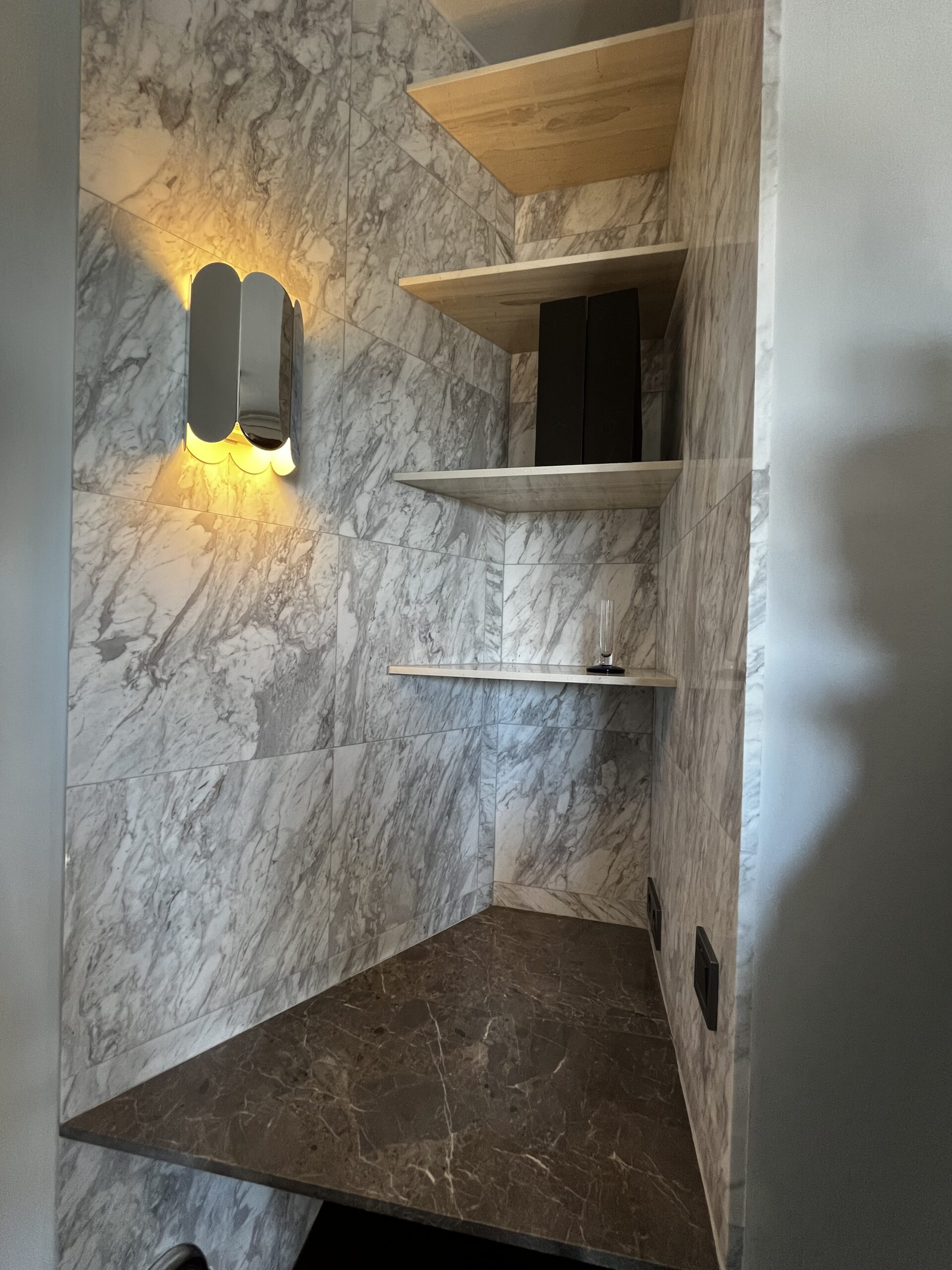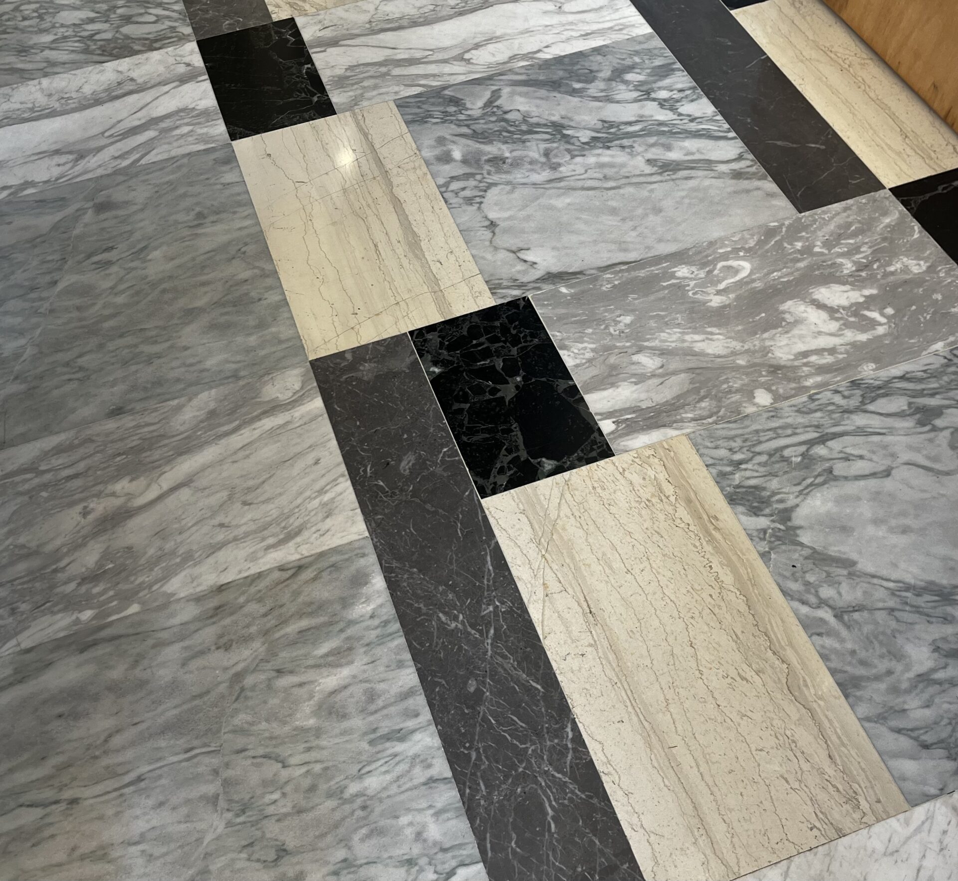 Ταυτόχρονα, το δάπεδο με επαναλαμβανόμενο μοτίβο, αποτελείται από πέντε διαφορετικά μάρμαρα, τα οποία συναντώνται και σε άλλους χώρους του διαμερίσματος, όπως στο μπάνιο και στο διάδρομο.