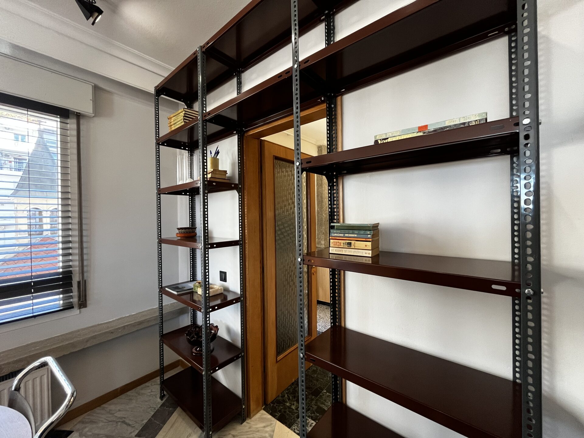 Περνώντας στον μεγάλο χώρο του γραφείου, η εσοχή στον τοίχο που κάποτε αποτελούσε αποθηκευτικό χώρο, πλέον είναι το ιδανικό μέρος για συγκέντρωση, δουλειά και διάβασμα, με το απαλό γαλάζιο στους τοίχους, το περσικό χαλί και τη βιβλιοθήκη με μεταλλικά ράφια, να κάνουν το δωμάτιο το κατάλληλο μέρος για εργασία και χαρά. Μάλιστα, τα ενοποιητικά στοιχεία των δωματίων γίνονται φανερά, με τη χαρακτηριστική βιβλιοθήκη αλλά και το γεγονός ότι στο υποστύλωμα έχει αφαιρεθεί και πάλι ο σοβάς για να φανεί το οπλισμένο σκυρόδεμα!