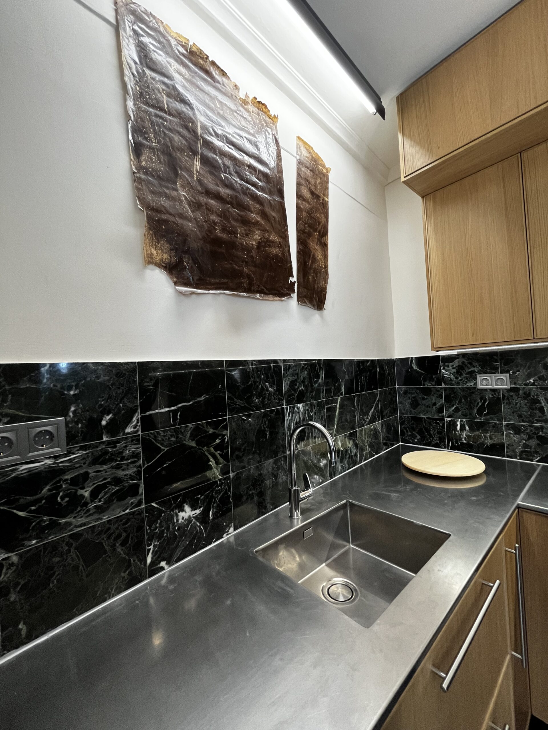 Η τραπεζαρία οδηγεί στην κουζίνα, η οποία είναι γεμάτη με μεγάλα και πολλά ντουλάπια και πλήρως εξοπλισμένη με όλες τις απαραίτητες εντοιχισμένες ηλεκτρικές συσκευές. Από την κουζίνα αφαιρέθηκε το κεραμικό πλακάκι από τους τοίχους και αντικαταστάθηκε με το μάρμαρο Βέροιας, με την λεπτομέρεια του σπατουλαριστού σοβά, ο οποίος έχει βαφτεί με λαδομπογιά, έτσι ώστε να είναι και πλενόμενος! Η σκληρότητα του μαρμάρινου υλικού του πάγκου έρχεται σε αντίθεση με τη μαλακότητα του ξύλου στα ντουλάπια.