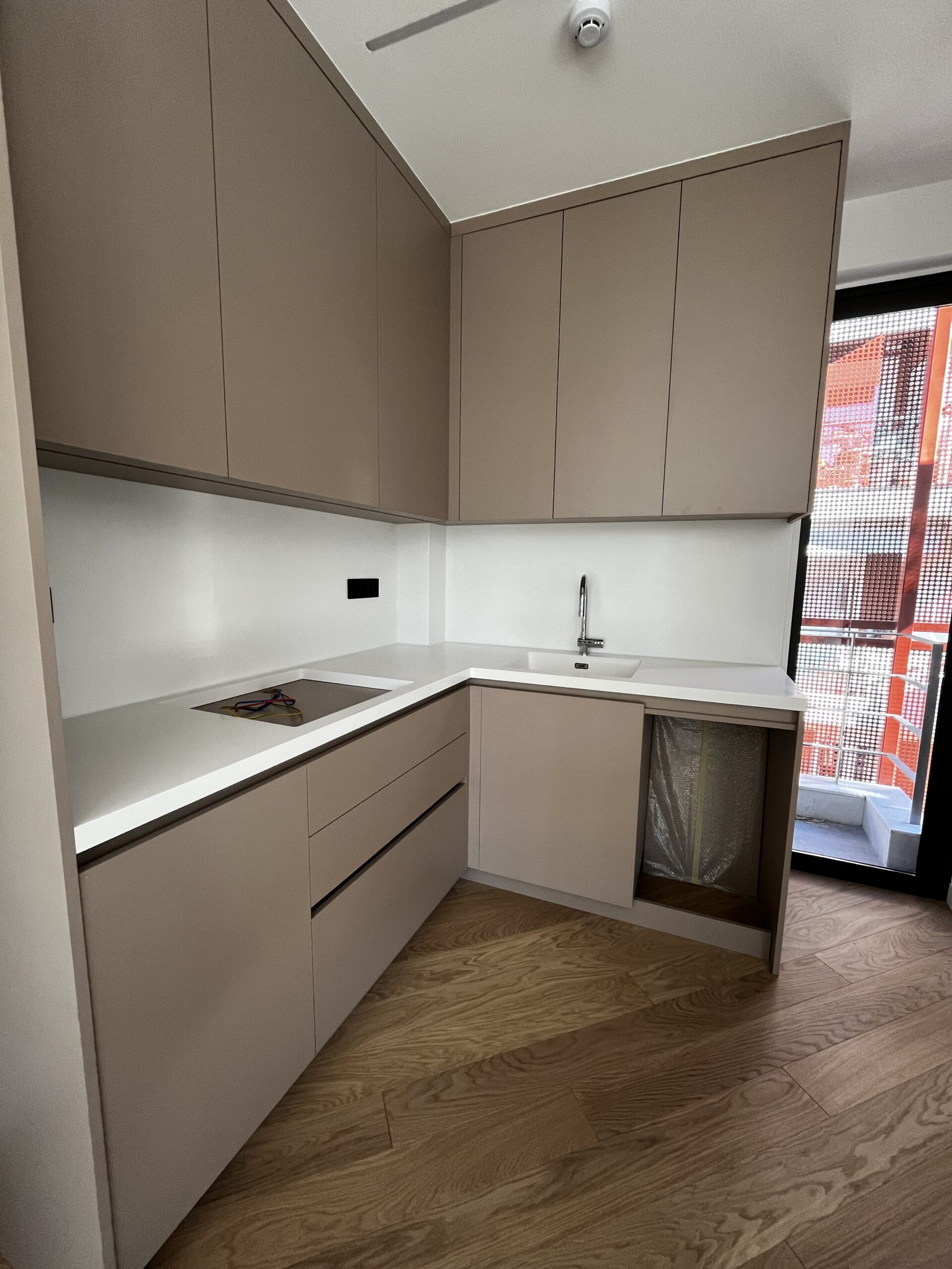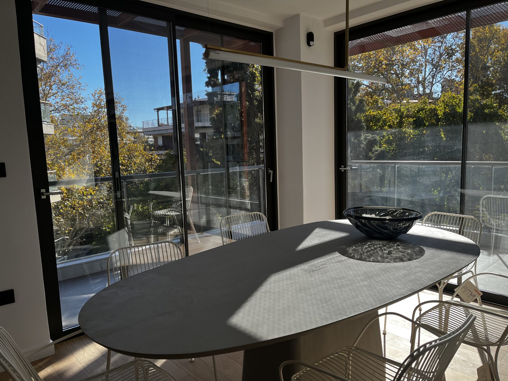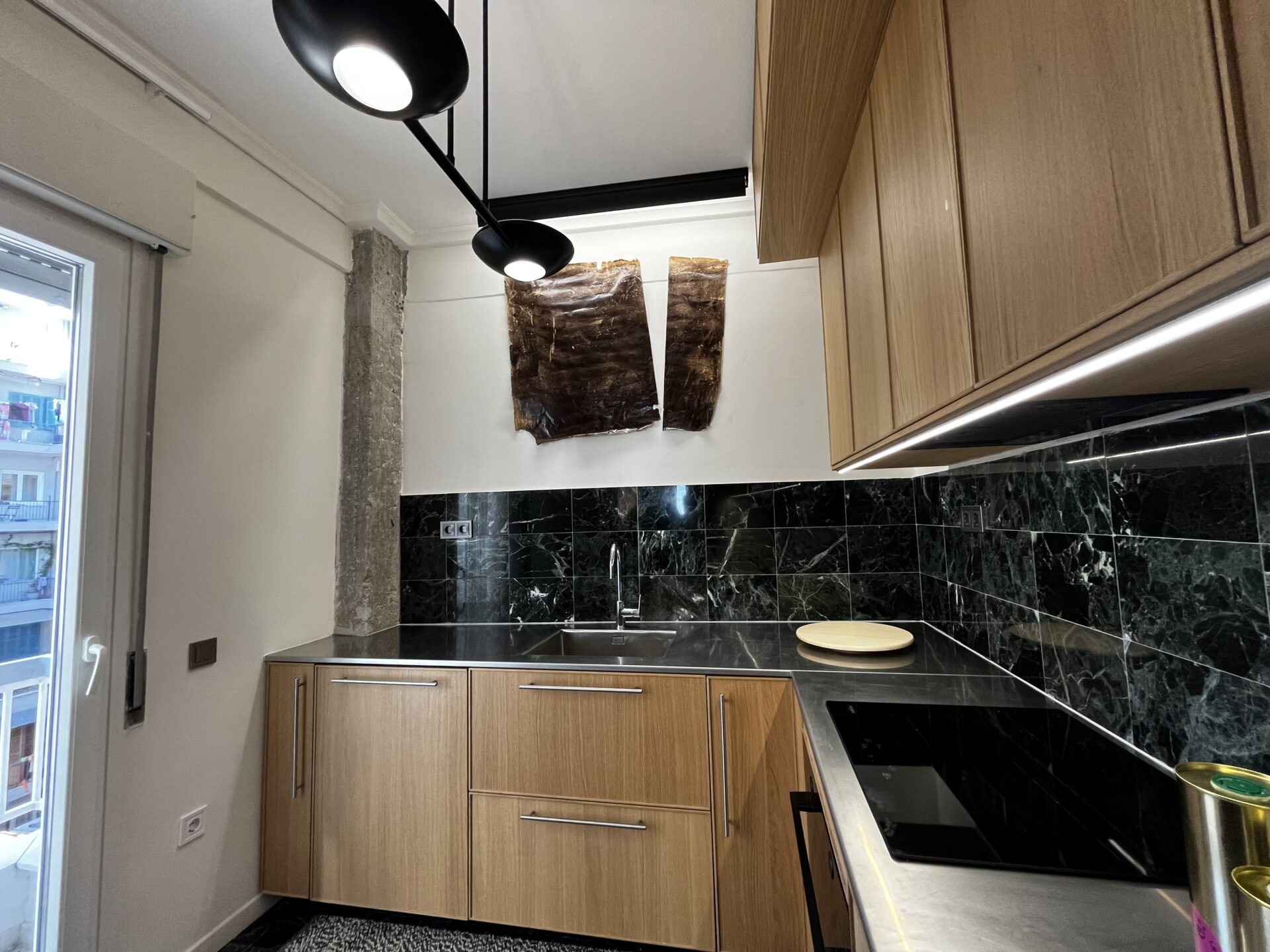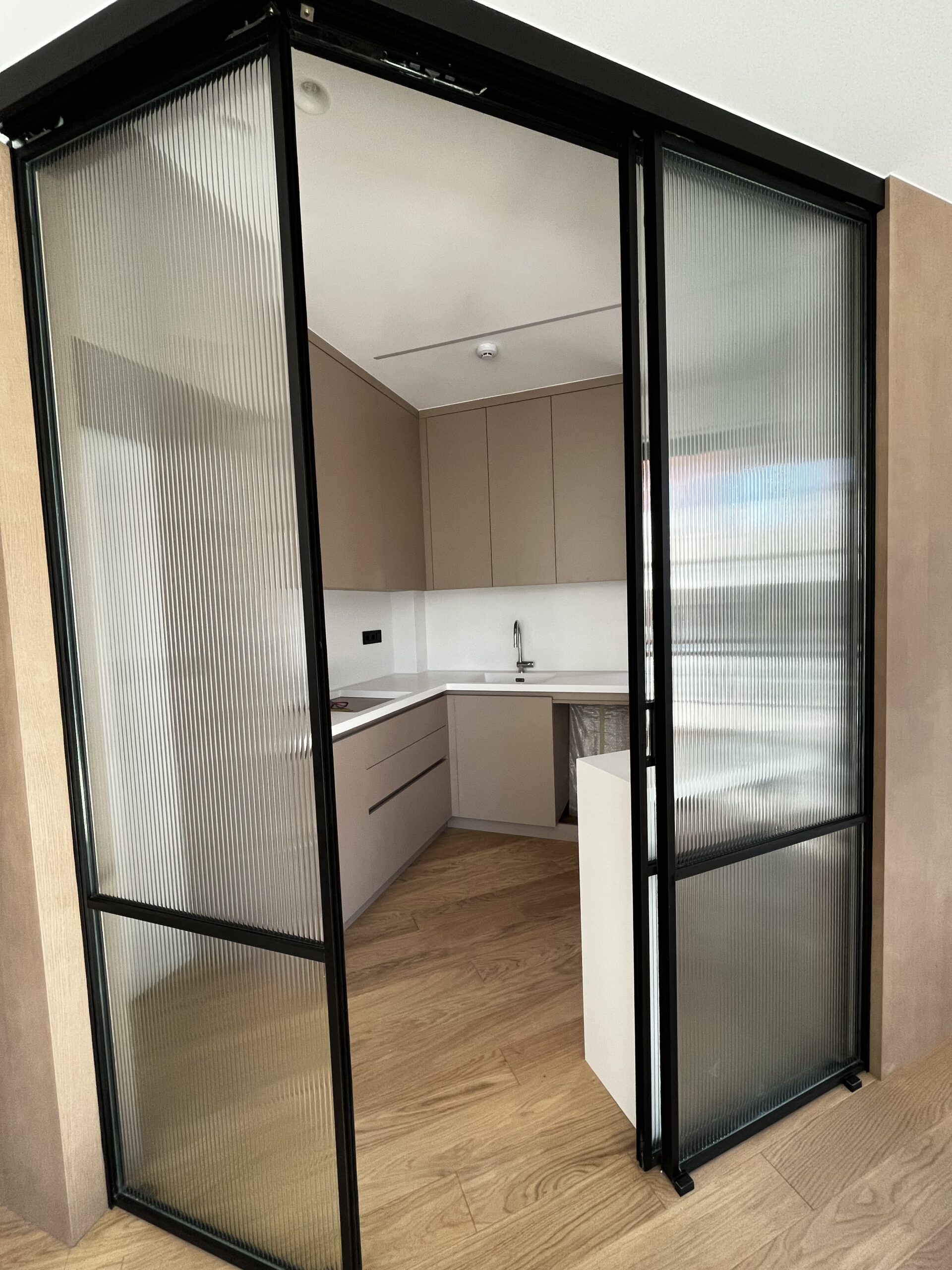 Η κουζίνα διαχωρίζεται από το σαλόνι με μία διακριτική συρόμενη πόρτα η οποία λόγω του μεταλλικού σκελετού της και του γυαλιού, καταφέρνει να μη στερείται τον άπλετο φωτισμό από τα μεγάλα παράθυρα του σαλονιού!