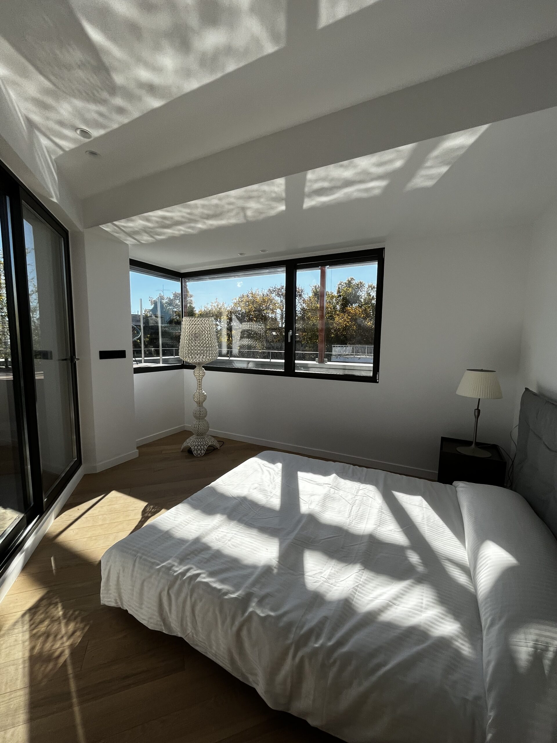 Η ευχάριστη έκπληξη βρίσκεται όμως στο επάνω επίπεδο του σπιτιού, στο οποίο κανείς μπορεί να μεταφερθεί από τις εσωτερικές σκάλες ή το… ασανσέρ! Εκεί, το master bedroom, δεν αποτελεί το κύριο σημείο ενδιαφέροντος, αλλά η πισίνα που βρίσκεται ακριβώς έξω από αυτό! Το roof garden με την πισίνα και το διάχυτο φως που προσφέρει στο cozy και πολυτελές υπνοδωμάτιο, αποτελεί μία «ανάσα δροσιάς» στον πυκνό αστικό ιστό!