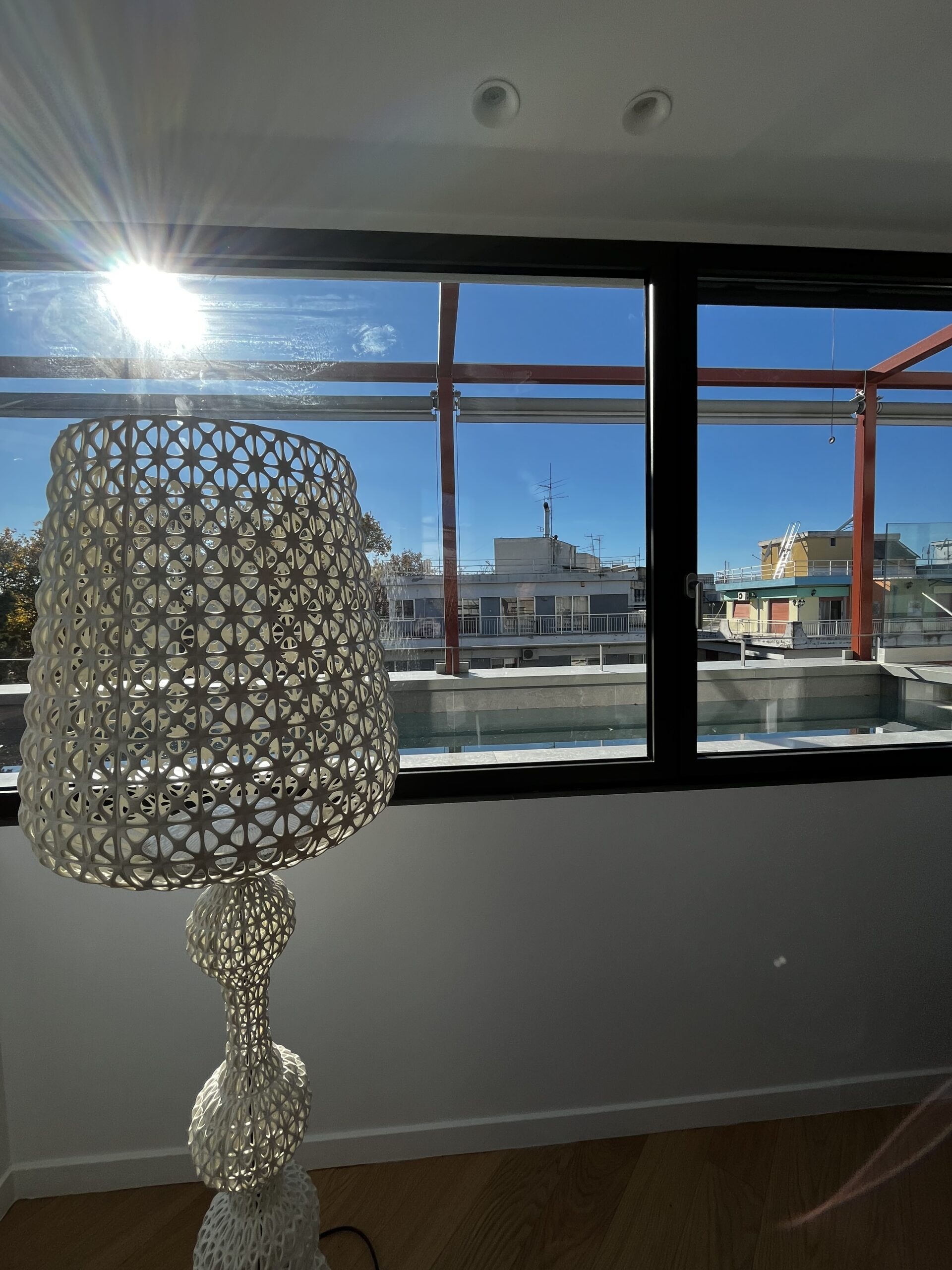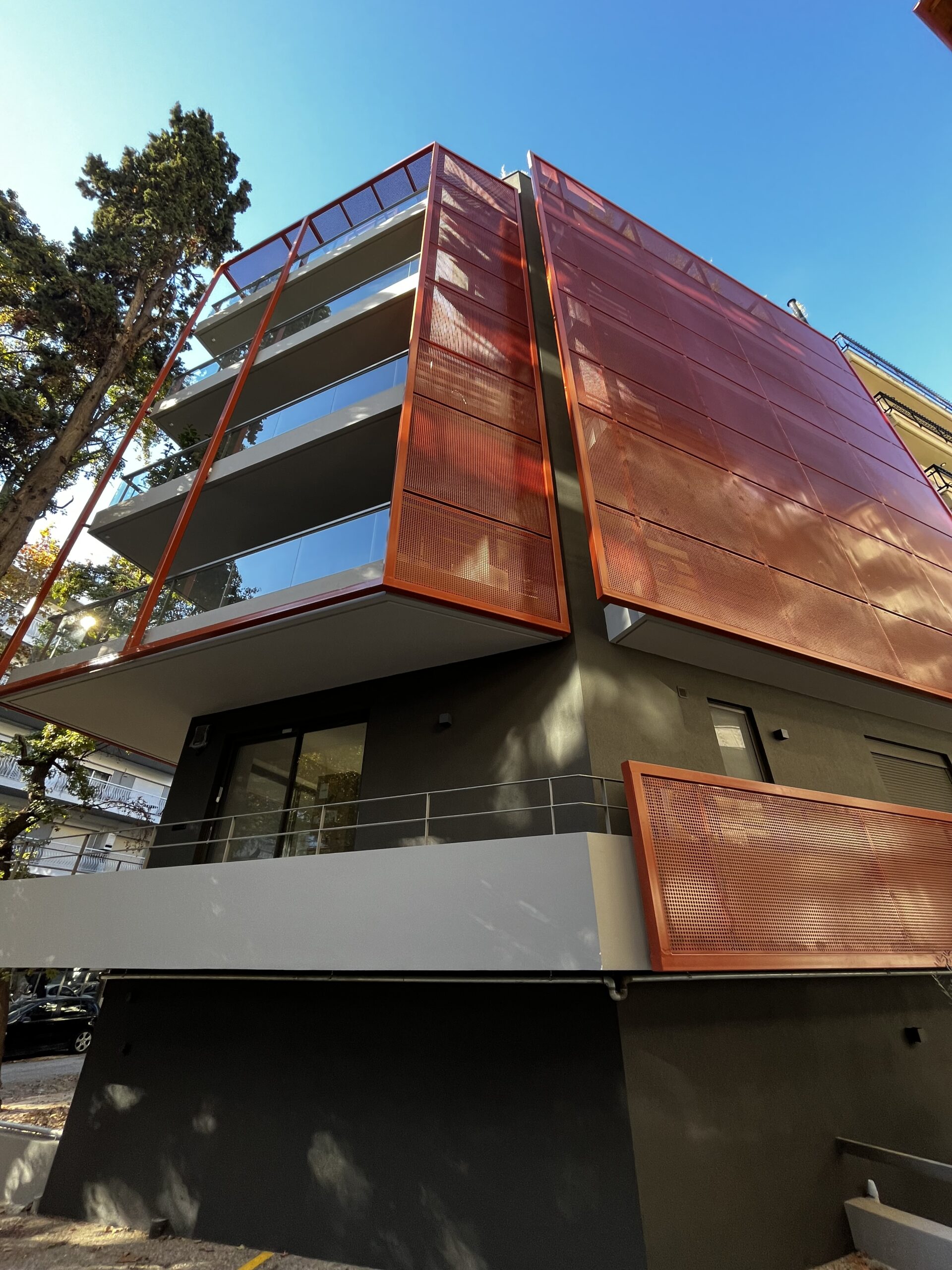 Κι’ όμως, η διπλοκατοικία στον κατάφυτο δρόμο της Καλαμαριάς, καταφέρνει να εντυπωσιάσει πριν ακόμα καν κάνουμε την είσοδο μας σε αυτήν, όταν αντικρίζουμε για πρώτη φορά την νεόδμητη θεόρατη πολυκατοικία του 2024, με την μορφολογική της λιτότητα! Η μεταλλική διάτρητη κατασκευή η οποία την περικλύζει, χρησιμεύει όχι μόνο στον σκιασμό των εξωστών και των μπαλκονιών, αλλά ταυτόχρονα προστατεύει την όψη από την ίσως ενοχλητική εγγύτητα με τα διπλανά κτίρια, δημιουργώντας έναν φλοιό. Άλλωστε, ποιος θέλει να πίνει τον καφέ του με τον γείτονα να κοιτάει αδιάκριτα στα δέκα μέτρα;