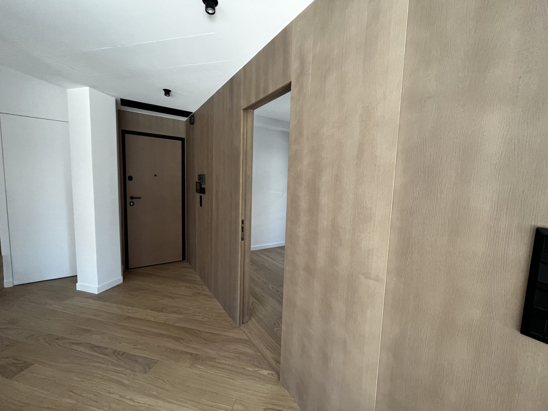 Έντονο χαρακτηριστικό του σπιτιού είναι οι κρυφές πόρτες που υπάρχουν, οι οποίες λειτουργούν με την ώθηση και οδηγούν όχι μόνο στο υπνοδωμάτιο, αλλά και σε αποθηκευτικούς χώρους, που μπορούν ακόμα να χρησιμοποιηθούν και ως πλυσταριό. Οι μαύρες λεπτομέρειες στους διακόπτες και στα σποτάκια φωτισμού, σε όλο το διαμέρισμα, καταφέρνουν να τον ενοποιούν με έναν μοντέρνο και ταυτόχρονα διακριτικό τρόπο.