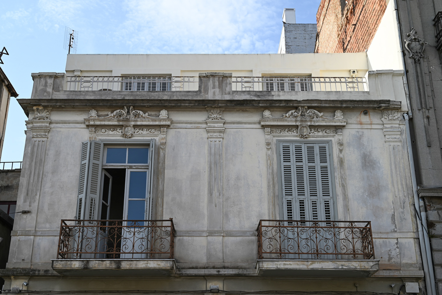 Χτίστηκε το 1911 με αρχική χρήση αυτή της κατοικίας. Σώθηκε από την φωτιά του 1917 και στην συνέχεια στέγασε γραφεία ναυτιλιακής εταιρείας. Τα πιο πρόσφατα χρόνια, αποτέλεσε μέρος της περιοχής των “κόκκινων φαναριών” της περιοχής του Λιμανιού. Το 1996 έγινε αποκατάσταση και έκτοτε είναι σε χρήση. Βρίσκεται δίπλα στο Μέγαρο Σουρουτζίεβιτς. Αποτελείται από ισόγειο διαμορφωμένο σε καταστήματα και δυο ορόφους, ο 2ος σε εσοχή, με μικρότερο εμβαδό και κεραμοσκεπή. Η όψη του οργανώνεται συμμετρικά με ανοίγματα εκατέρωθεν του κεντρικού άξονα.