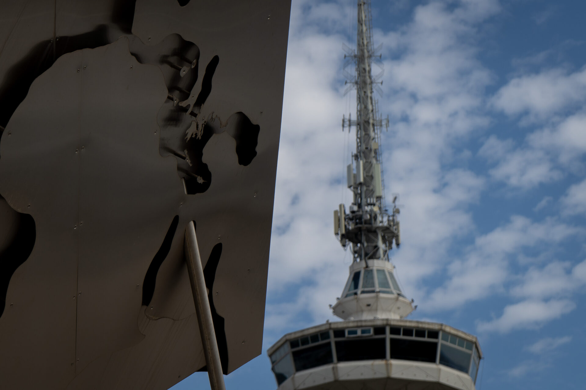 Η προσεκτική παρατήρηση της πλάγιας όψης των κτιριακών εγκαταστάσεων αποκαλύπτει πως πρόκειται για την ανάπτυξη, σε μεγάλη κλίμακα, μιας σφήνας, η οποία τείνει να ανασηκώσει μια σφαίρα, τη Γη.