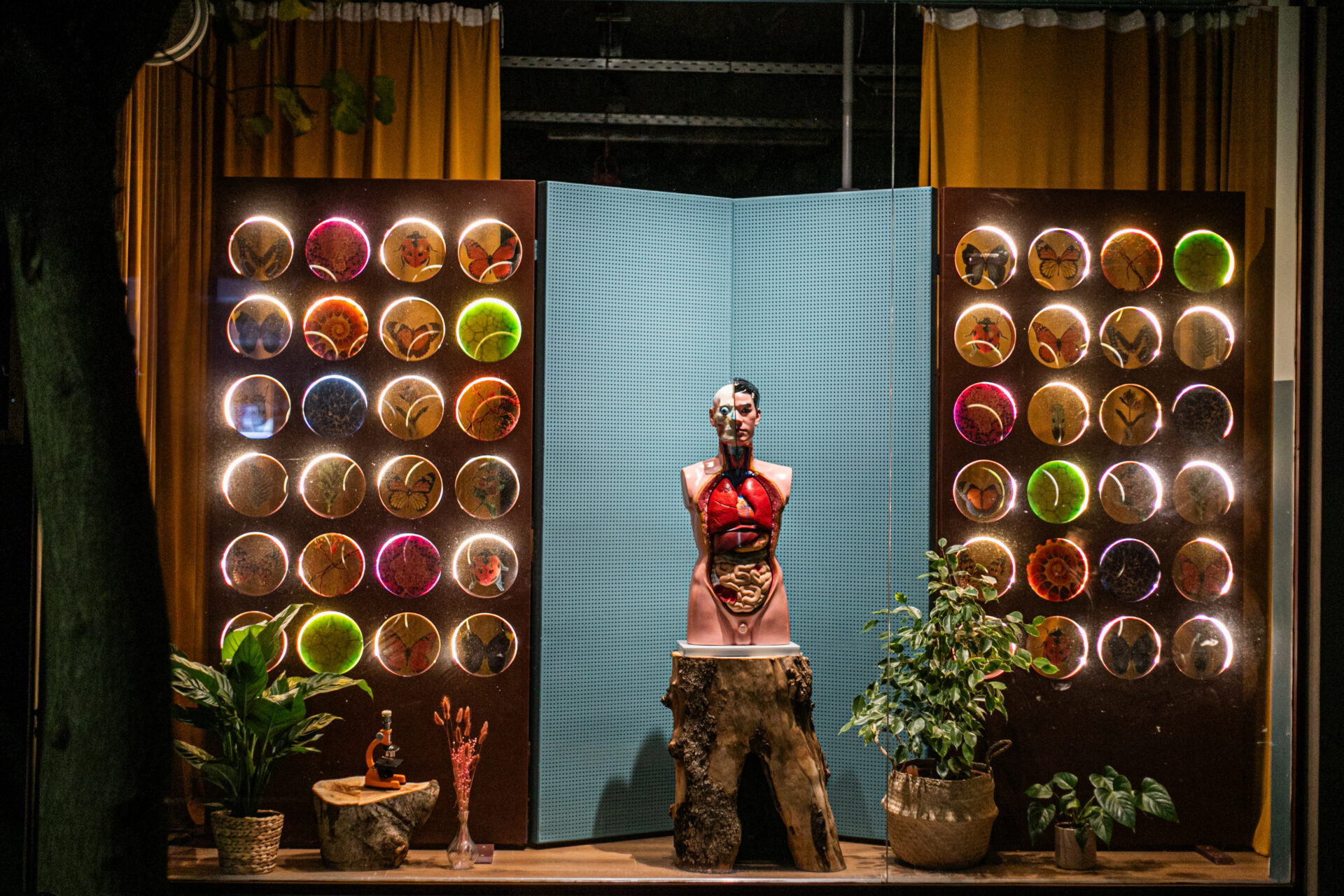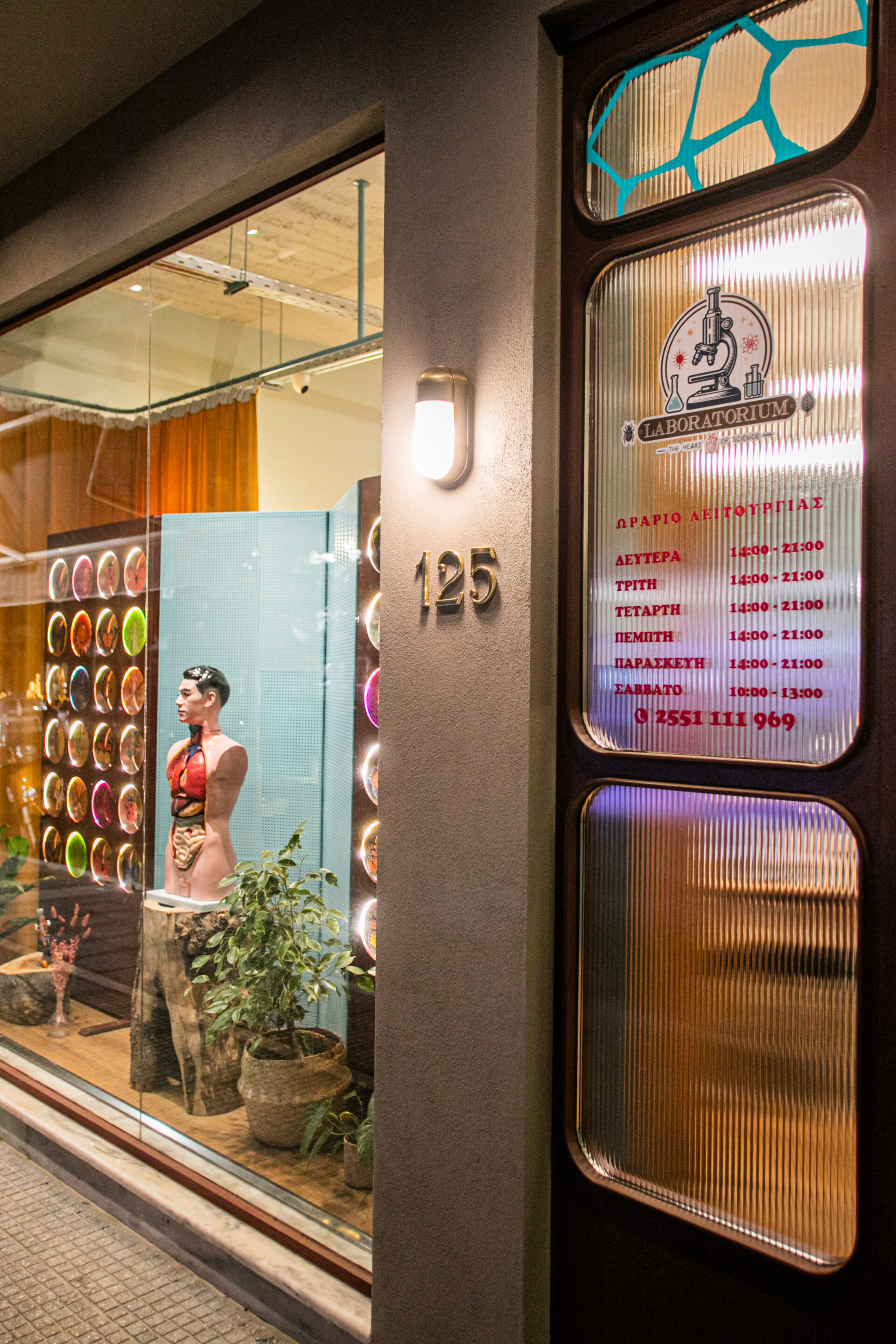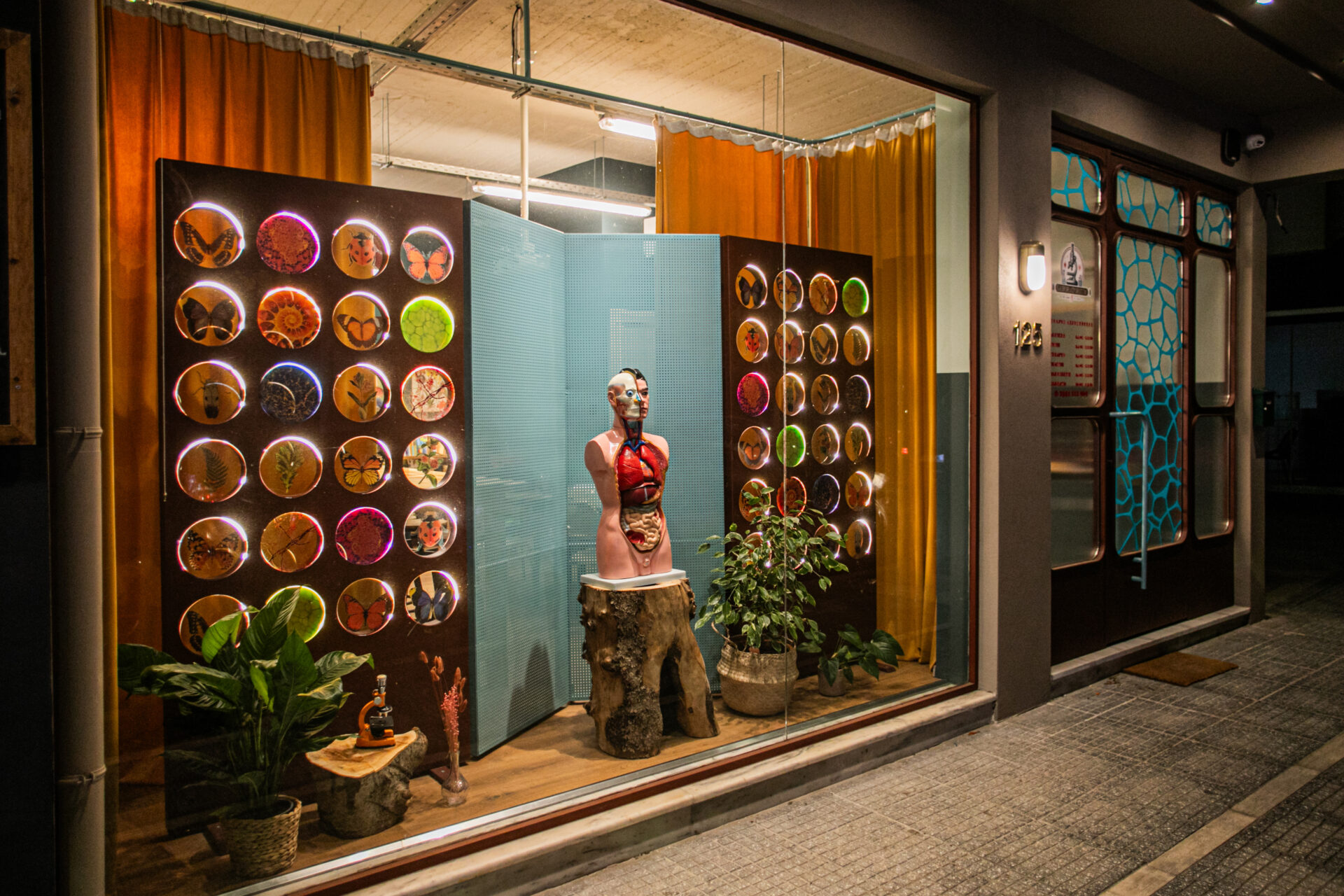 Οι υπερμεγέθεις εικόνες μικροσκοπίου στα υαλοπετάσματα της μεταλλικής κατασκευής της βιτρίνας, το πρόπλασμα ανθρώπινου σώματος ως κεντρικό της στοιχείο και η μεγάλων διαστάσεων πόρτα εισόδου steampunk αισθητικής καθορίζουν την σχέση περιεχόμενου και μορφής.