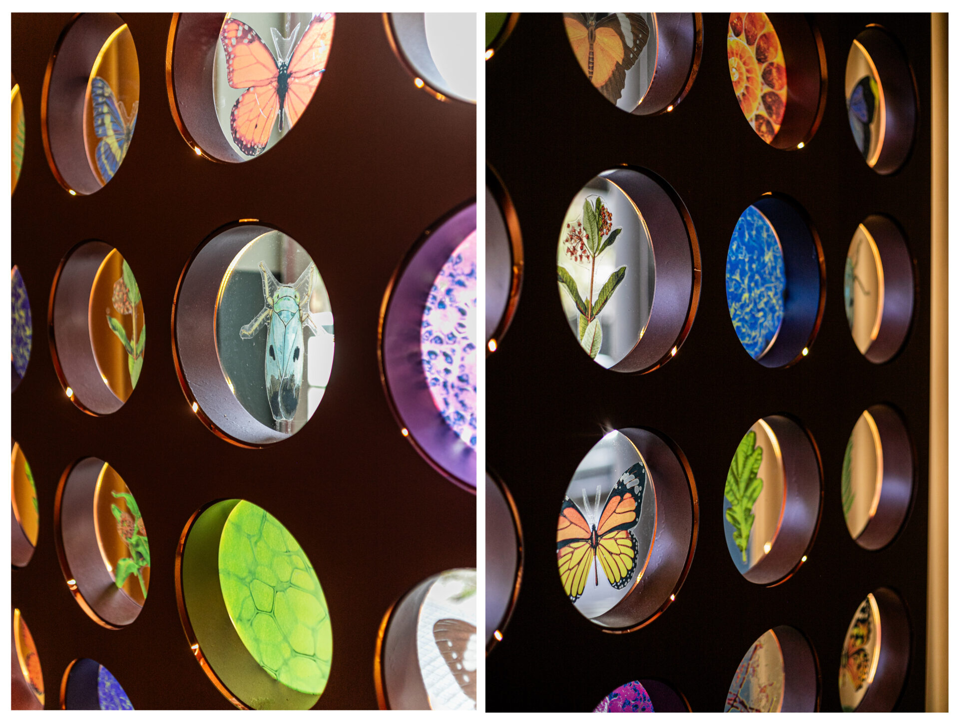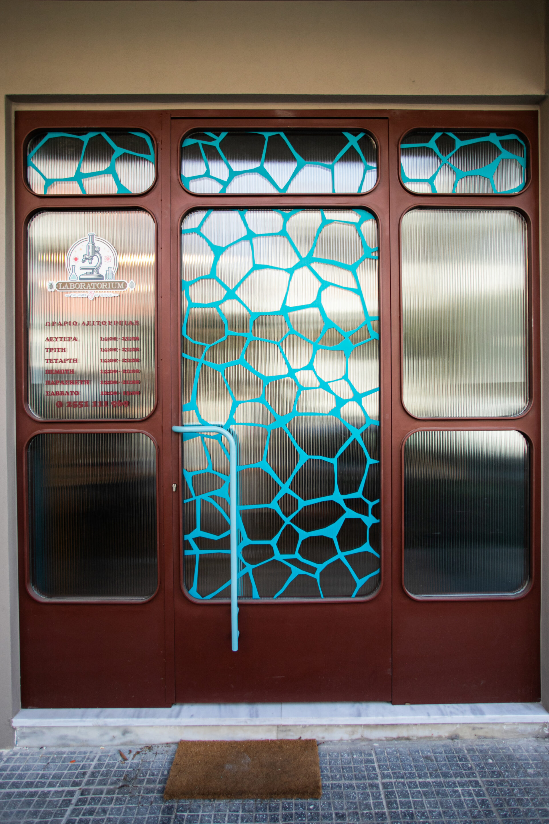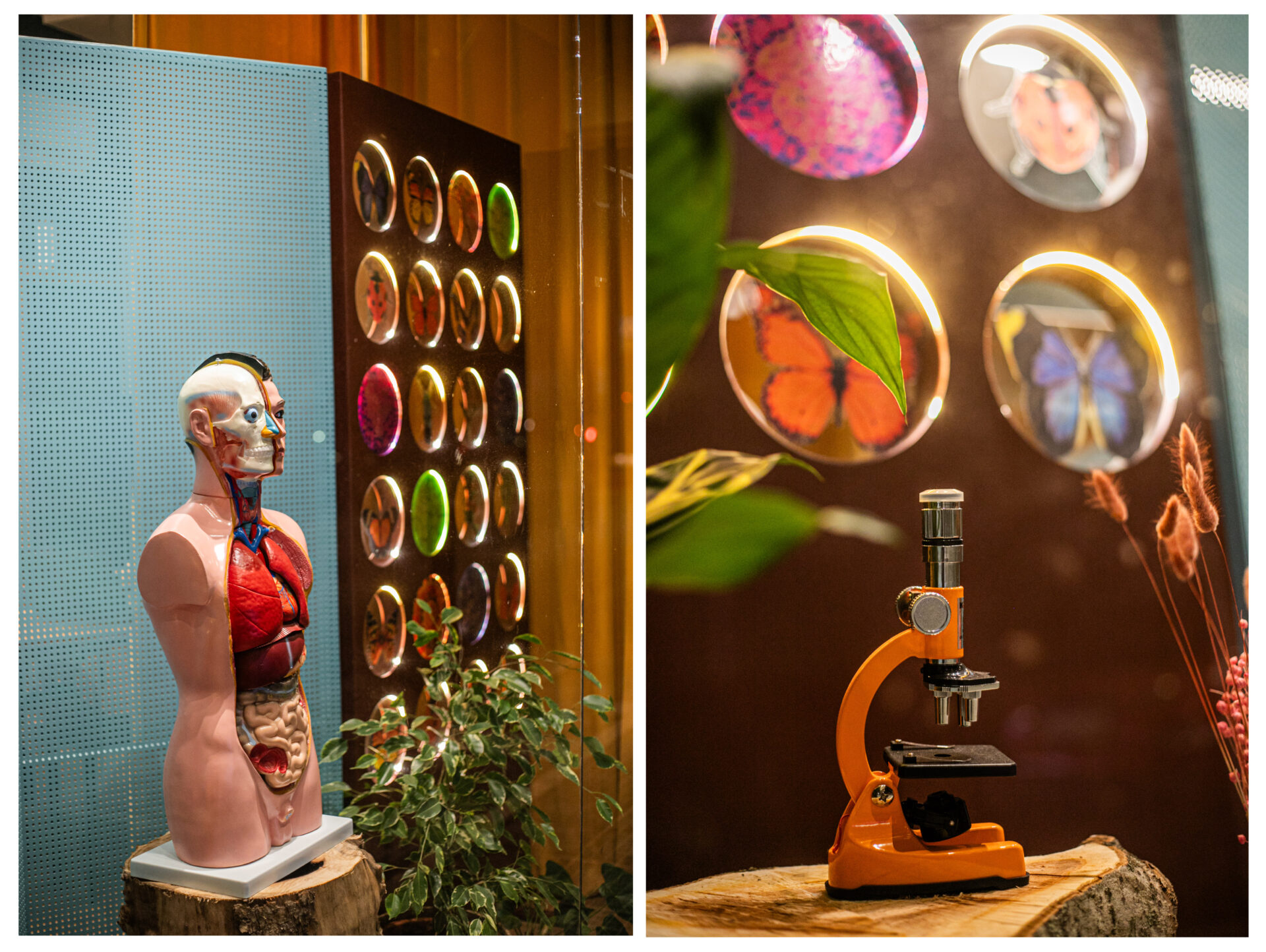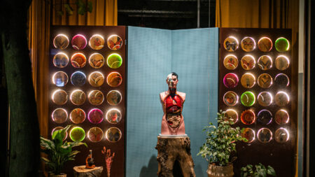 Οι υπερμεγέθεις εικόνες μικροσκοπίου στα υαλοπετάσματα της μεταλλικής κατασκευής της βιτρίνας, το πρόπλασμα ανθρώπινου σώματος ως κεντρικό της στοιχείο και η μεγάλων διαστάσεων πόρτα εισόδου steampunk αισθητικής καθορίζουν την σχέση περιεχόμενου και μορφής.