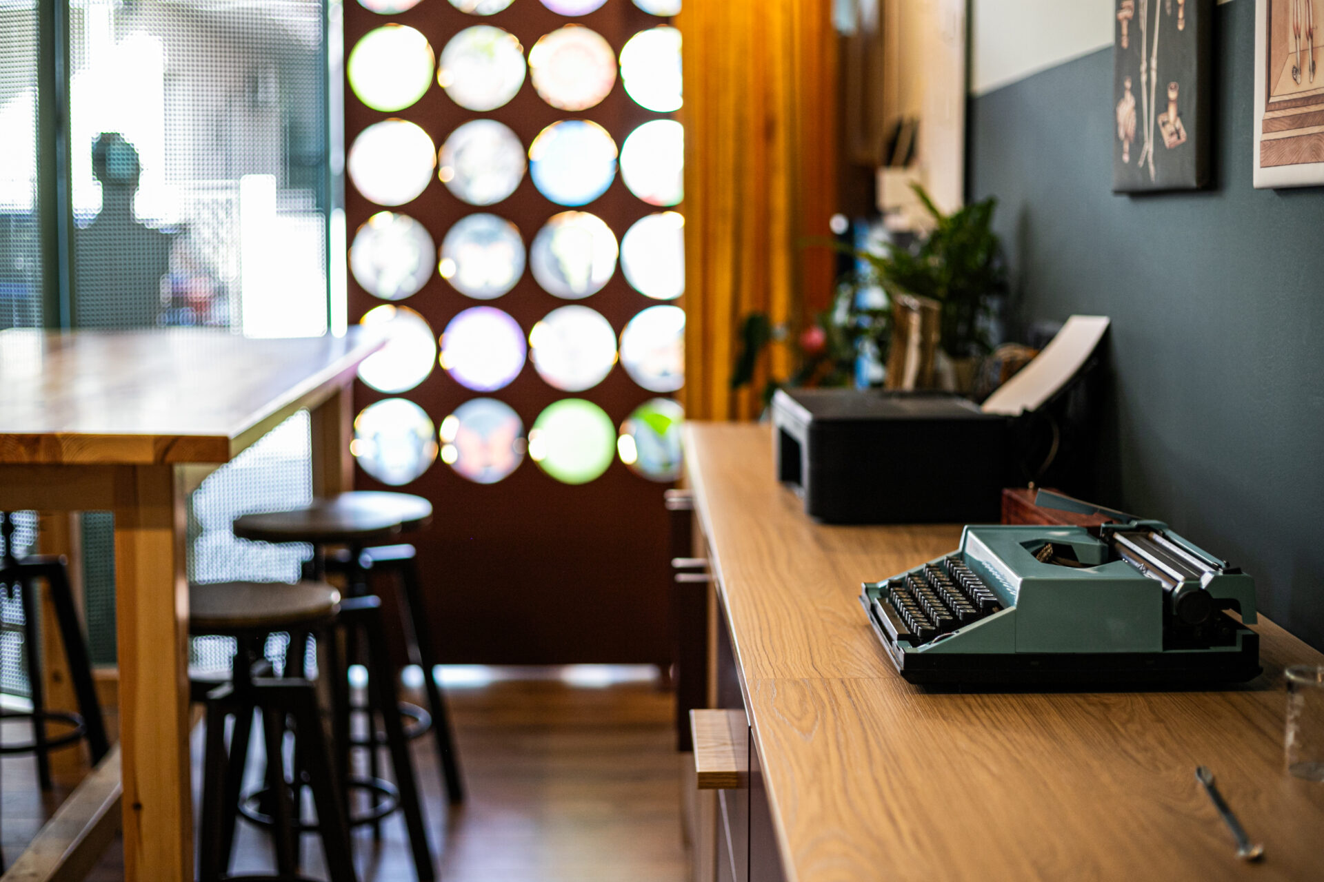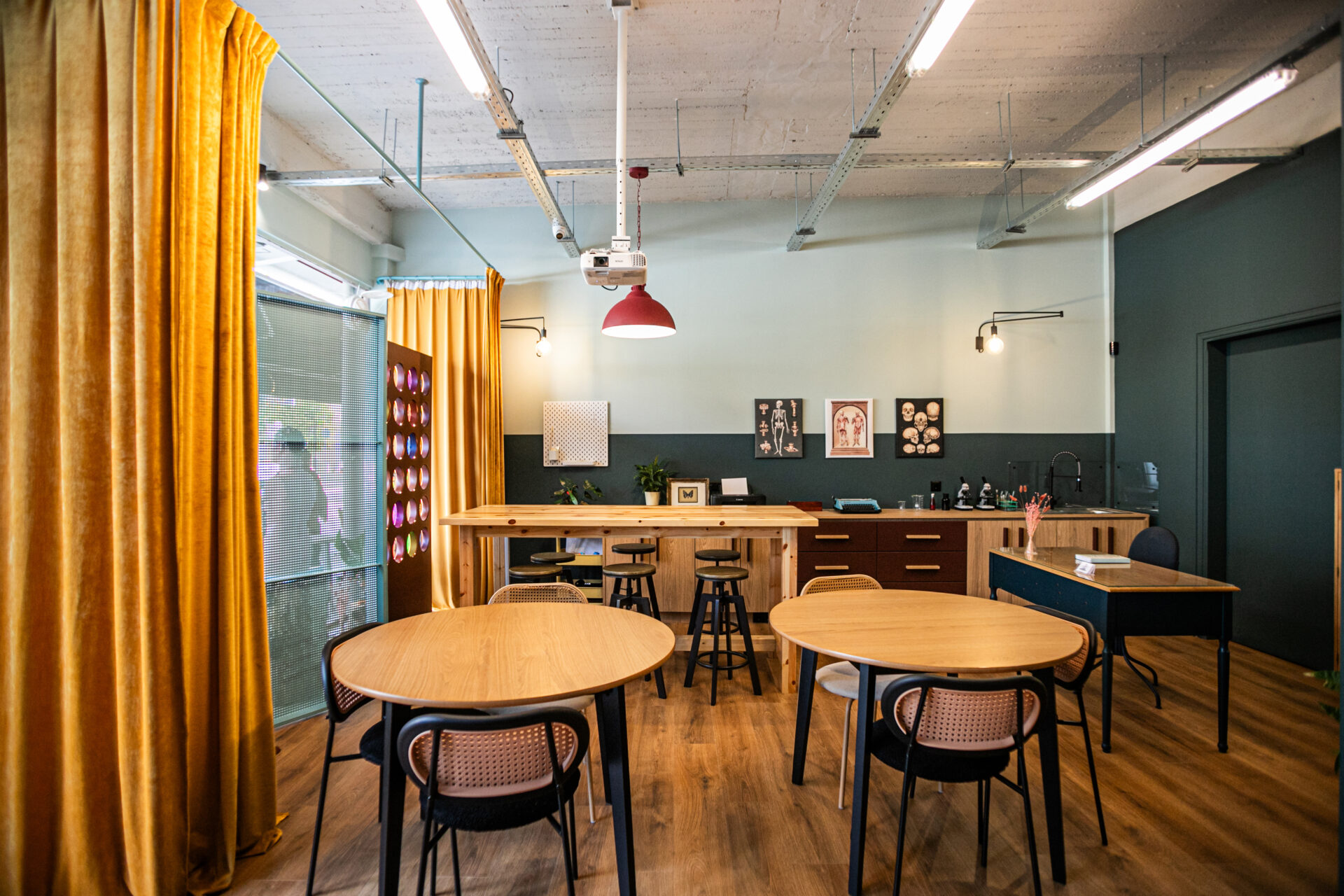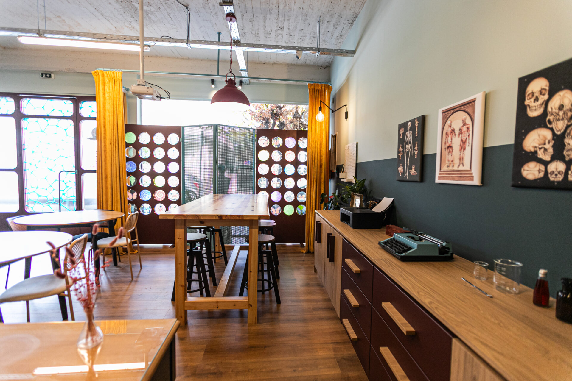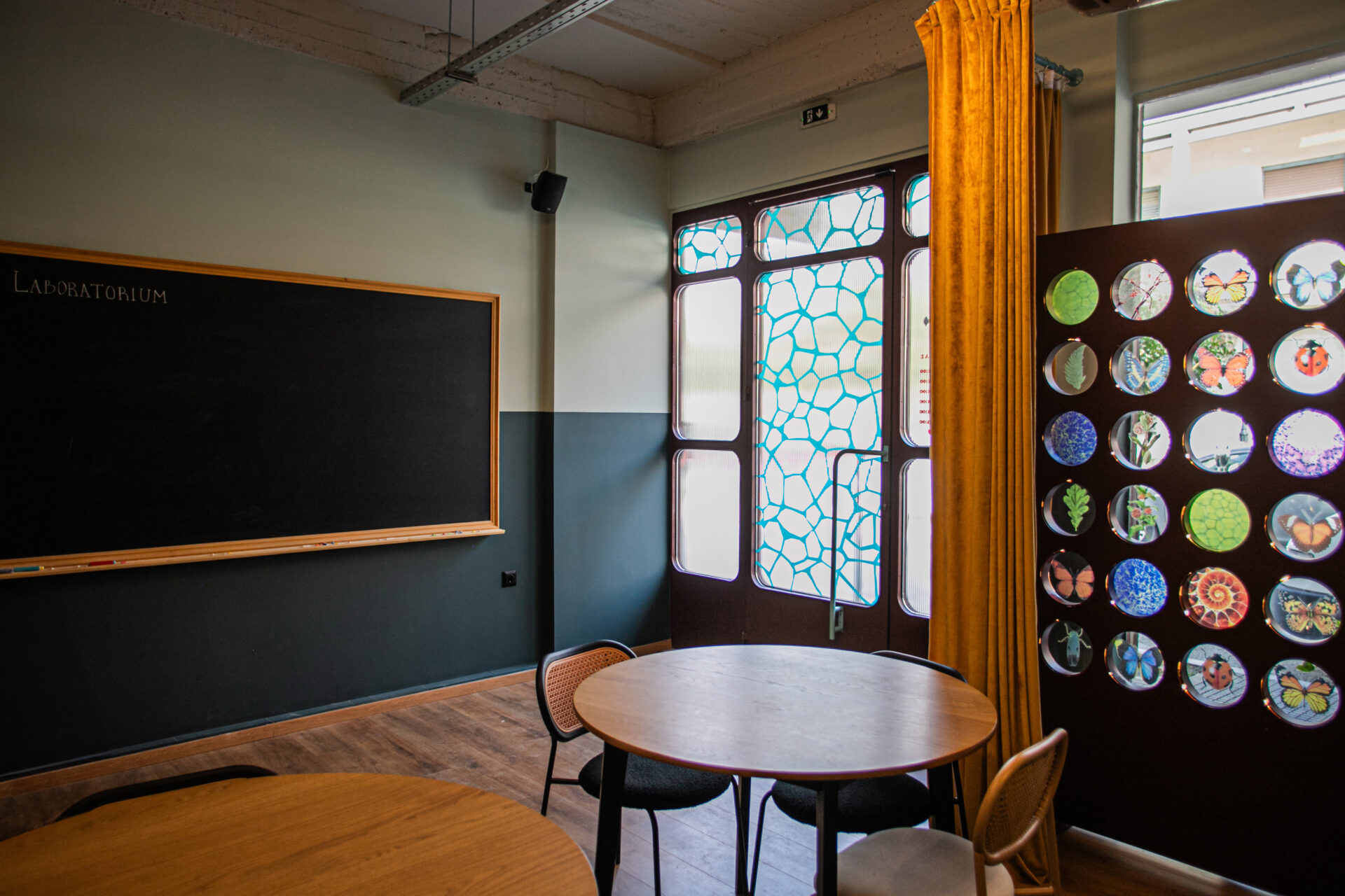 Στο εσωτερικό του χώρου 35 τμ., επιλέχθηκε χρωματική αντίθεση με κυρίαρχη τη διχρωμία παλιάς σχολικής αίθουσας στις επιφάνειες. Έντονα χρώματα προστέθηκαν σε διακοσμητικά στοιχεία και στις κουρτίνες, δημιουργώντας μια σκηνογραφική ατμόσφαιρα που μαγνητίζει το μάτι.