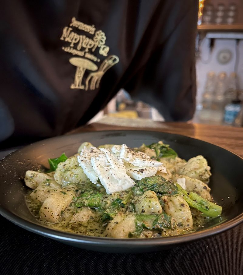 Το χειροποίητο είναι σήμα κατατεθέν του μπιστρό, οπότε από τη λίστα δεν απουσιάζουν και τα νιόκι. Από πατάτα και τυρί, μας τα σερβίρανε με μια δική τους πέστο και τριμμένη σφέλα από παραδοσιακό τυροκομείο της Μεσσηνίας, για έναν πιο πικάντικο τόνο. Μακράν ήταν τα πιο ζυμαρένια και νόστιμα νιόκι που έχω δοκιμάσει ποτέ. Φυσικά, από το τραπέζι μας δεν έλειψε η ξηρή μυζήθρα με γλυκό του κουταλιού σταφύλι -από τον κήπο της οικογένειας-, η σπιτική φάβα και η πατατοσαλάτα.