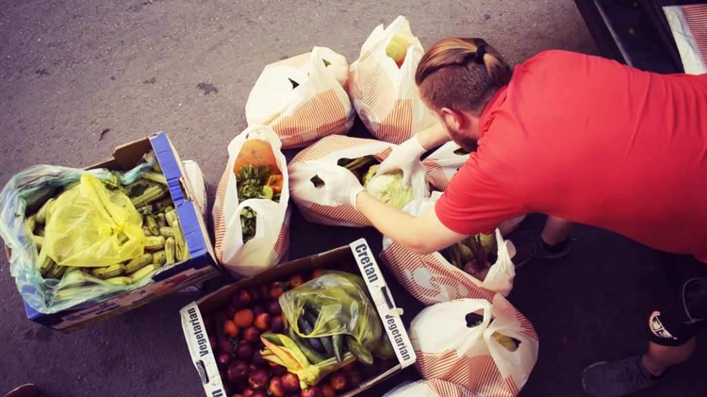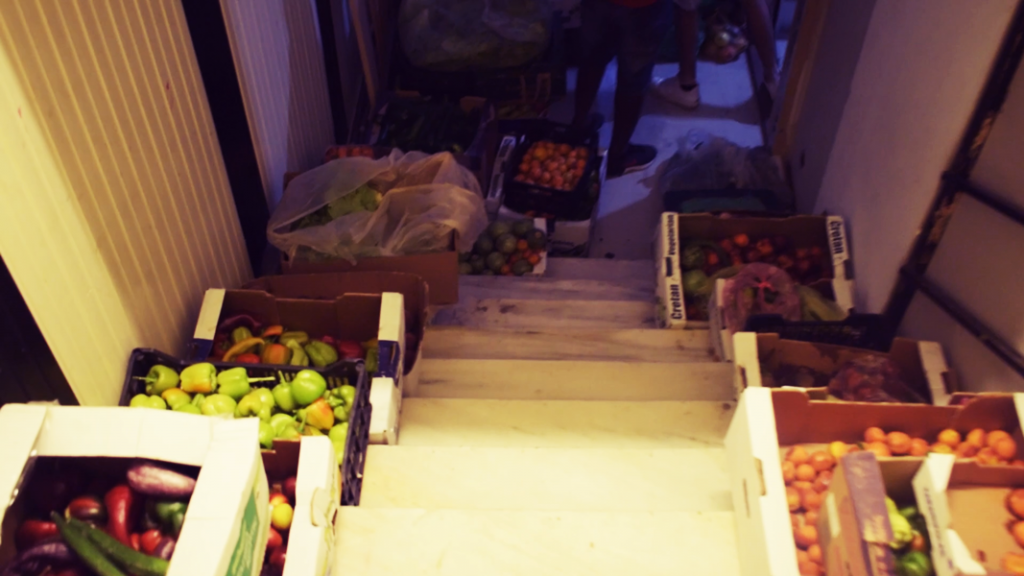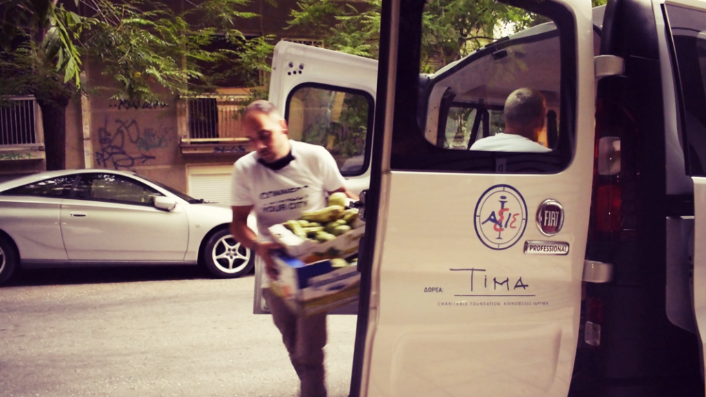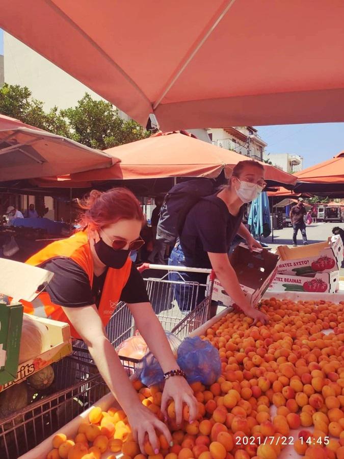 Εθελοντές της Παρέμβασης μεταβαίνουν στο τέλος της λαϊκής αγοράς και προμηθεύονται λαχανικά και φρούτα προς διανομή σε ανθρώπους.