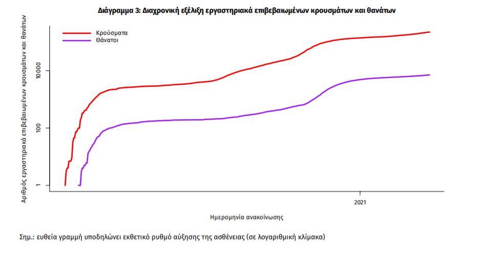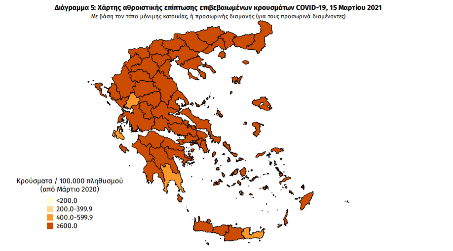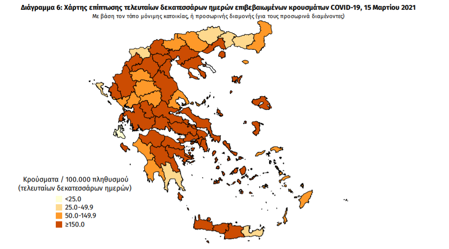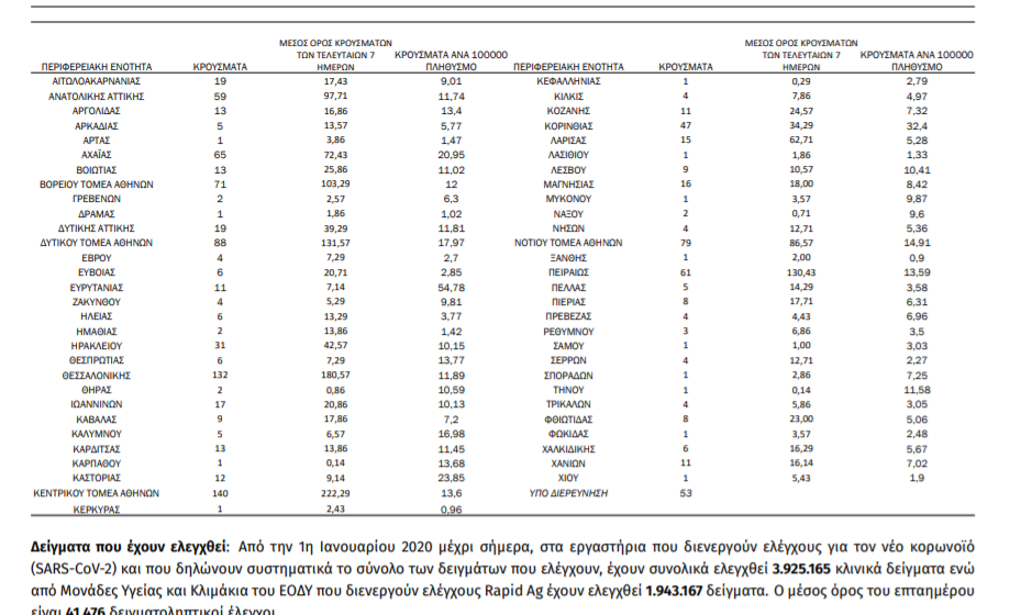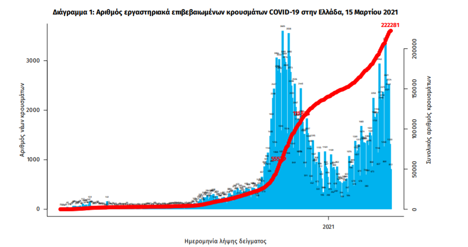 Τα νέα εργαστηριακά επιβεβαιωμένα κρούσματα της νόσου που καταγράφηκαν τις τελευταίες 24 ώρες είναι 1.134, εκ των οποίων 13 εντοπίστηκαν κατόπιν ελέγχων στις πύλες εισόδου της χώρας. Ο συνολικός αριθμός των κρουσμάτων ανέρχεται σε 222.281 (ημερήσια μεταβολή +0.5%), εκ των οποίων 51.6% άνδρες. Με βάση τα επιβεβαιωμένα κρούσματα των τελευταίων 7 ημερών, 61 θεωρούνται σχετιζόμενα με ταξίδι από το εξωτερικό και 1.744 είναι σχετιζόμενα με ήδη γνωστό κρούσμα.