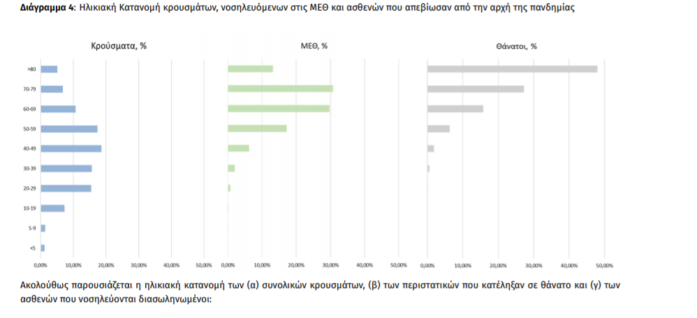 Ο αριθμός των ασθενών που νοσηλεύονται διασωληνωμένοι είναι 510 (61.0% άνδρες). Η διάμεση ηλικία τους είναι 67 έτη. To 86.3% έχει υποκείμενο νόσημα ή/και ηλικία 70 ετών και άνω. Από την αρχή της πανδημίας έχουν εξέλθει από τις ΜΕΘ 2.417 ασθενείς. Οι εισαγωγές1 νέων ασθενών Covid-19 στα νοσοκομεία της επικράτειας είναι 203 (ημερήσια μεταβολή -12.12%). Ο μέσος όρος εισαγωγών του επταημέρου είναι 218 ασθενείς.Η διάμεση ηλικία των κρουσμάτων είναι 44 έτη (εύρος 0.2 έως 106 έτη), ενώ η διάμεση ηλικία των θανόντων είναι 78 έτη (εύρος 0.2 έως 106 έτη).