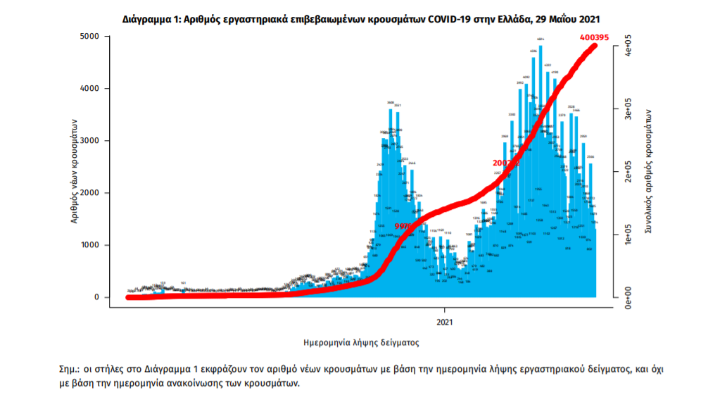 Τα νέα εργαστηριακά επιβεβαιωμένα κρούσματα της νόσου που καταγράφηκαν τις τελευταίες 24 ώρες είναι 1.497, εκ των οποίων 1 εντοπίστηκαν κατόπιν ελέγχων στις πύλες εισόδου της χώρας. Ο συνολικός αριθμός των κρουσμάτων ανέρχεται σε 400.395 (ημερήσια μεταβολή +0.4%), εκ των οποίων 51.2% άνδρες. Με βάση τα επιβεβαιωμένα κρούσματα των τελευταίων 7 ημερών, 25 θεωρούνται σχετιζόμενα με ταξίδι από το εξωτερικό και 2.152 είναι σχετιζόμενα με ήδη γνωστό κρούσμα.