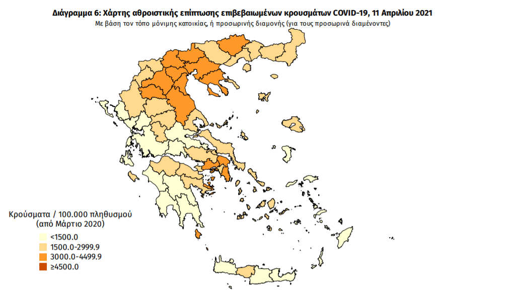 Οι νέοι θάνατοι ασθενών με COVID-19 είναι 52, ενώ από την έναρξη της επιδημίας έχουν καταγραφεί συνολικά 8.885 θάνατοι. Το 95.6% είχε υποκείμενο νόσημα ή/και ηλικία 70 ετών και άνω.