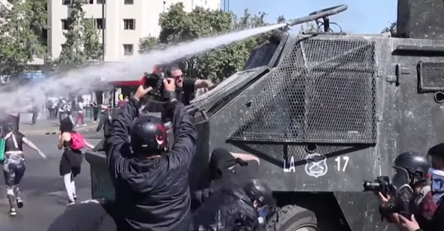 Δύο συγκεντρώσεις σε πλατείες της πρωτεύουσας της Χιλής ήταν ειρηνικές, αλλά η αστυνομία χρησιμοποίησε δακρυγόνα και αντλίες νερού υπό πίεση για να διαλύσει μια μικρή ομάδα που πέταγε πέτρες, έστησε οδοφράγματα και λεηλάτησε ένα κατάστημα, σύμφωνα με το τηλεοπτικό δίκτυο 24 Horas. «Έξω οι στρατιωτικοί!», φώναζαν διαδηλωτές απευθυνόμενοι στις ισχυρές δυνάμεις του στρατού, των καραμπινιέρων και της αστυνομίας που είχαν αναπτυχθεί. «Η Χιλή ξύπνησε!», φώναζαν άλλοι, χτυπώντας κουζινικά, ενώ ένα ελικόπτερο έκανε κύκλους πάνω από το πλήθος. «Θα χυθεί αίμα. Μας έχουν κλείσει όλες τις πόρτες», είπε ένας από τους διαδηλωτές, ένας 30χρονος οδοντίατρος, που κράταγε ένα πλακάτ με το οποίο απαιτούσε την παραίτηση του προέδρου Πινιέρα.