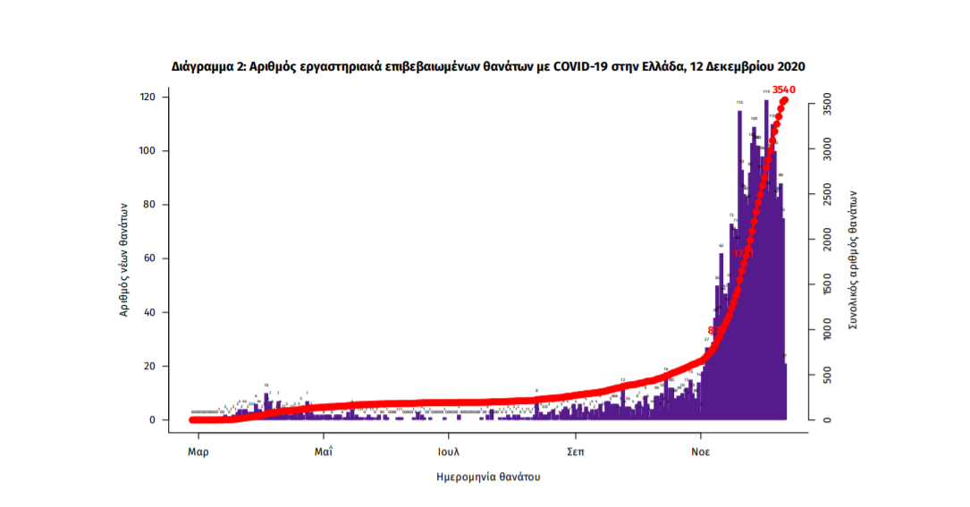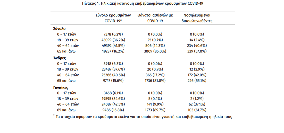 Τέλος, έχουμε 68 ακόμα καταγεγραμμένους θανάτους και 3540 θανάτους συνολικά στη χώρα. 1421 (40.1%) γυναίκες και οι υπόλοιποι άνδρες. Η διάμεση ηλικία των θανόντων συμπολιτών μας ήταν τα 79 έτη και το 95.9% είχε κάποιο υποκείμενο νόσημα ή/και ηλικία 70 ετών και άνω.
