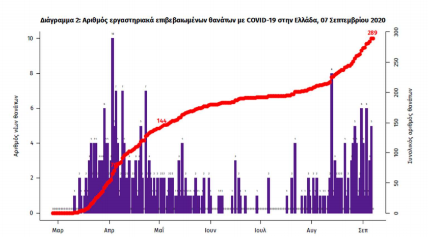 Τέλος, έχουμε 5 ακόμα καταγεγραμμένους θανάτους και 289 θανάτους συνολικά στη χώρα. 107 (37.0%) γυναίκες και οι υπόλοιποι άνδρες. Η διάμεση ηλικία των θανόντων συμπολιτών μας ήταν τα 78 έτη και το 96.2% είχε κάποιο υποκείμενο νόσημα ή/και ηλικία 70 ετών και άνω.