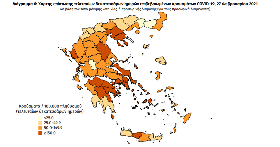 Τα στοιχεία που παρουσιάζονται αφορούν περιστατικά από την επιδημιολογική επιτήρηση της νόσου από το νέο κορωνοϊό (COVID19), με βάση τα δεδομένα που έχουν δηλωθεί στον ΕΟΔΥ και καταγραφεί μέχρι τις 27 Φεβρουαρίου 2021 (ώρα 15:00).