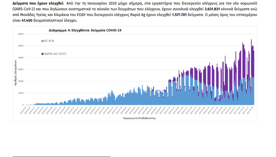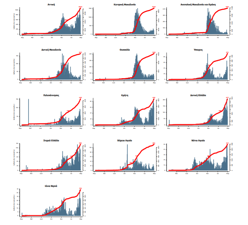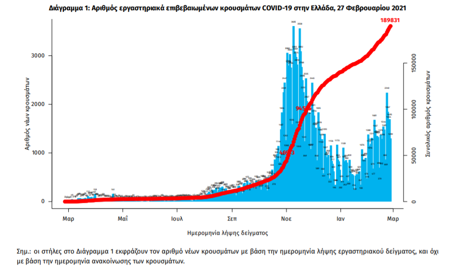 Τα νέα εργαστηριακά επιβεβαιωμένα κρούσματα της νόσου που καταγράφηκαν τις τελευταίες 24 ώρες είναι 1.630, εκ των οποίων 5 εντοπίστηκαν κατόπιν ελέγχων στις πύλες εισόδου της χώρας. Ο συνολικός αριθμός των κρουσμάτων ανέρχεται σε 189.831 (ημερήσια μεταβολή +0.9%), εκ των οποίων 51.8% άνδρες. Με βάση τα επιβεβαιωμένα κρούσματα των τελευταίων 7 ημερών, 52 θεωρούνται σχετιζόμενα με ταξίδι από το εξωτερικό και 2.550 είναι σχετιζόμενα με ήδη γνωστό κρούσμα. Ημερήσια εξέλιξη της πανδημίας: Η ημερήσια κατανομή των επιβεβαιωμένων κρουσμάτων είναι η ακόλουθη (η γραμμή παριστάνει την συνολική, αθροιστική κατανομή των κρουσμάτων).