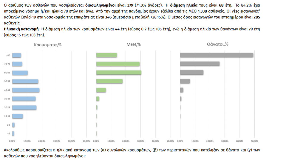 Ο αριθμός των ασθενών που νοσηλεύονται διασωληνωμένοι είναι 379 (71.0% άνδρες). Η διάμεση ηλικία τους είναι 68 έτη. To 84.2% έχει υποκείμενο νόσημα ή/και ηλικία 70 ετών και άνω. Από την αρχή της πανδημίας έχουν εξέλθει από τις ΜΕΘ 1.338 ασθενείς. Οι νέες εισαγωγές1 ασθενών Covid-19 στα νοσοκομεία της επικράτειας είναι 346 (ημερήσια μεταβολή +28.15%). Ο μέσος όρος εισαγωγών του επταημέρου είναι 285 ασθενείς.