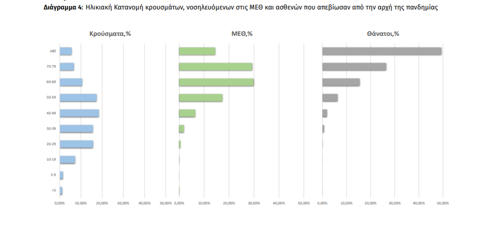 Ο αριθμός των ασθενών που νοσηλεύονται διασωληνωμένοι είναι 672 (66.7% άνδρες). Η διάμεση ηλικία τους είναι 68 έτη. To 82.0% έχει υποκείμενο νόσημα ή/και ηλικία 70 ετών και άνω. Από την αρχή της πανδημίας έχουν εξέλθει από τις ΜΕΘ 1.572 ασθενείς. Οι εισαγωγές2 νέων ασθενών Covid-19 στα νοσοκομεία της επικράτειας είναι 513 (ημερήσια μεταβολή +1.18%). Ο μέσος όρος εισαγωγών του επταημέρου είναι 469 ασθενείς.Η διάμεση ηλικία των κρουσμάτων είναι 44 έτη (εύρος 0.2 έως 105 έτη), ενώ η διάμεση ηλικία των θανόντων είναι 79 έτη (εύρος 0 έως 103 έτη)