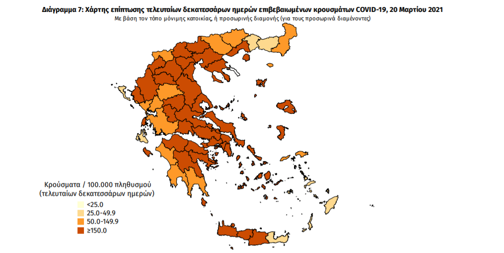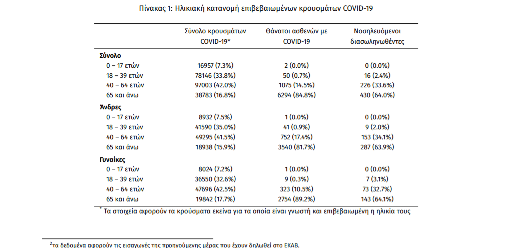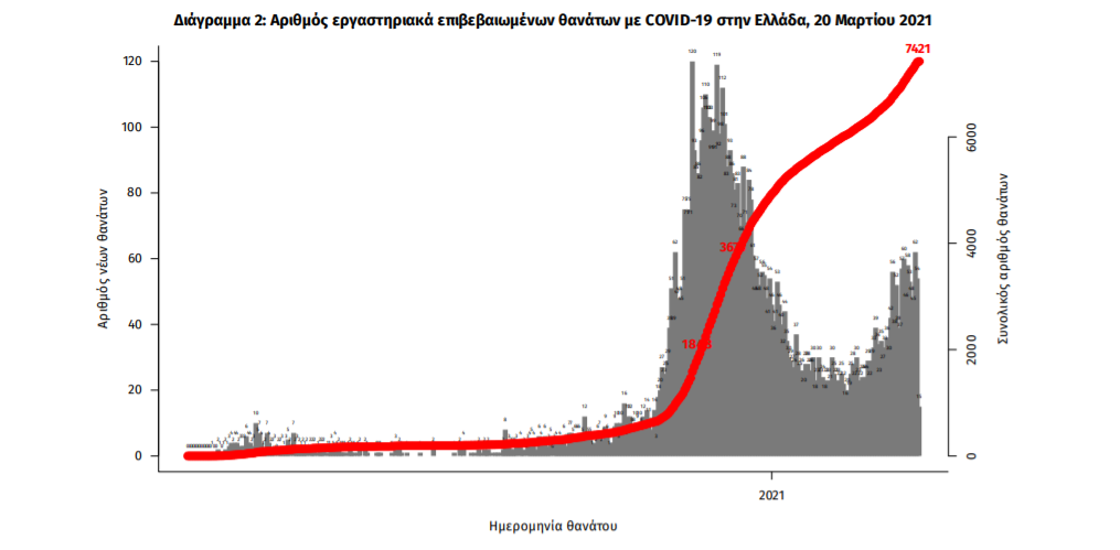 Οι νέοι θάνατοι ασθενών με COVID-19 είναι 60, ενώ από την έναρξη της επιδημίας έχουν καταγραφεί συνολικά 7.421 θάνατοι. Το 95.8% είχε υποκείμενο νόσημα ή/και ηλικία 70 ετών και άνω.