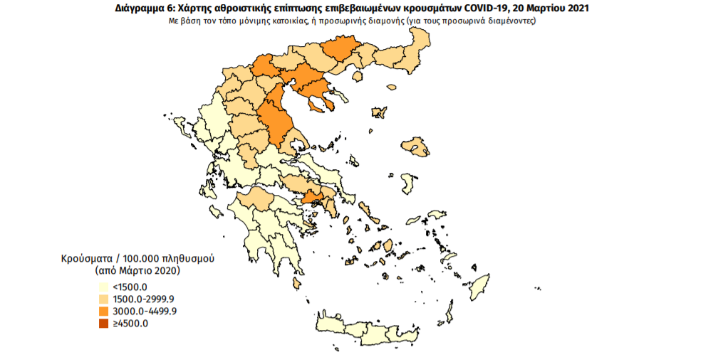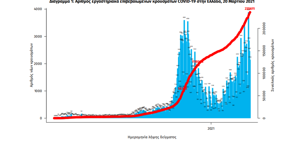 Τα νέα εργαστηριακά επιβεβαιωμένα κρούσματα της νόσου που καταγράφηκαν τις τελευταίες 24 ώρες είναι 2.535, εκ των οποίων 11 εντοπίστηκαν κατόπιν ελέγχων στις πύλες εισόδου της χώρας. Ο συνολικός αριθμός των κρουσμάτων ανέρχεται σε 235.611 (ημερήσια μεταβολή +1.1%), εκ των οποίων 51.6% άνδρες. 1 Με βάση τα επιβεβαιωμένα κρούσματα των τελευταίων 7 ημερών, 67 θεωρούνται σχετιζόμενα με ταξίδι από το εξωτερικό και 2.362 είναι σχετιζόμενα με ήδη γνωστό κρούσμα.