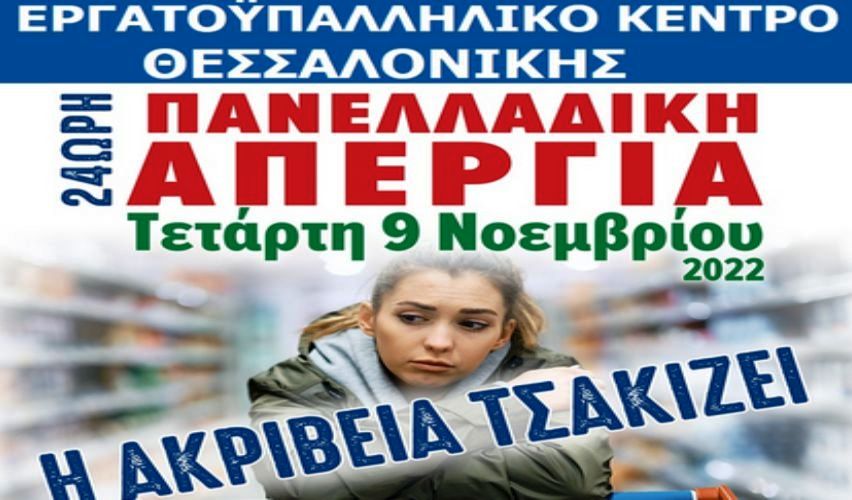 Στη Θεσσαλονίκη το Εργατικό Κέντρο Θεσσαλονίκης με κεντρικό σύνθημα, «η ακρίβεια τσακίζει», καλεί όλους τους εργαζόμενους να απεργήσουν και να συμμετέχουν στην απεργιακή εκδήλωση στις 10.30 πμ, μπροστά στο κτίριο του ΕΚΘ.