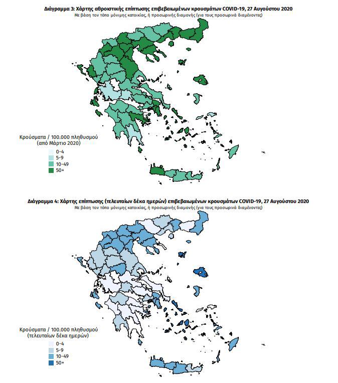 Σήμερα, 27/8/2020, δηλώθηκαν 259 επιπλέον κρούσματα. Από τα 228 εγχώρια κρούσματα, τα 26 συνδέονται με πρόσφατο ταξίδι στο εσωτερικό της χώρας, τα 14 με ιχνηλατήσεις επιβεβαιωμένων κρουσμάτων και 4 με γνωστές συρροές.